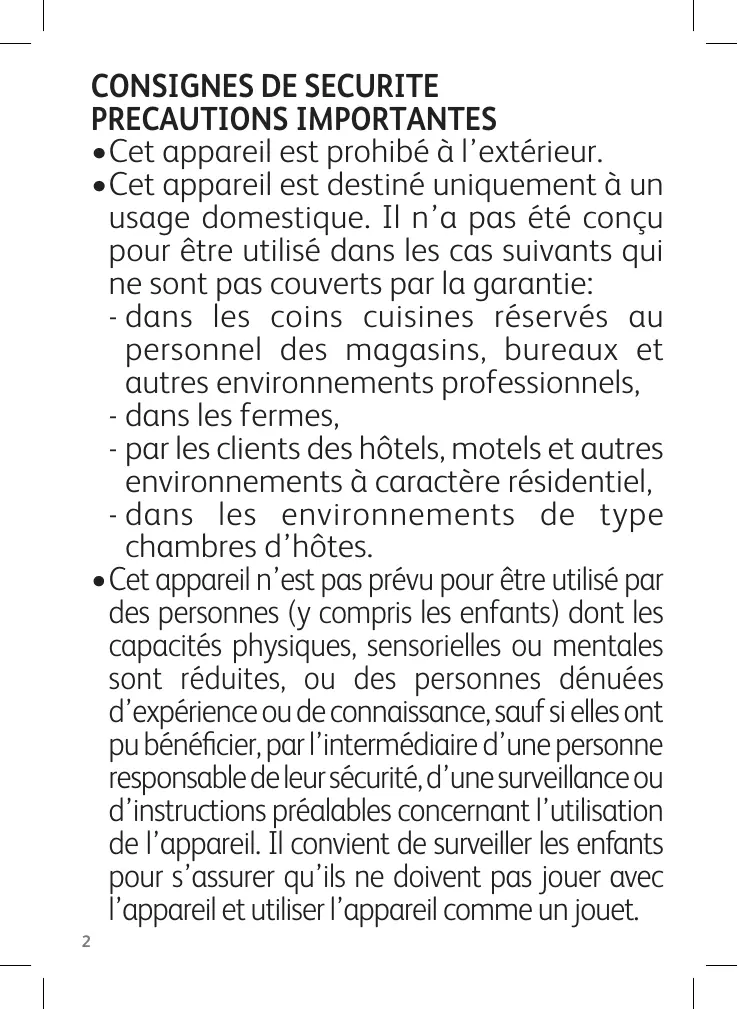 - Cet appareil est destiné uniquement à un usage domestique. Il n’a pas été conçu pour être utilisé dans les cas suivants qui ne sont pas couverts par la garantie: - dans les coins cuisines réservés au personnel des magasins, bureaux et autres environnements professionnels, - dans les fermes, - par les clients des hôtels, motels et autres environnements à caractère résidentiel, - d ans les environnements de type chambres d’hôtes.