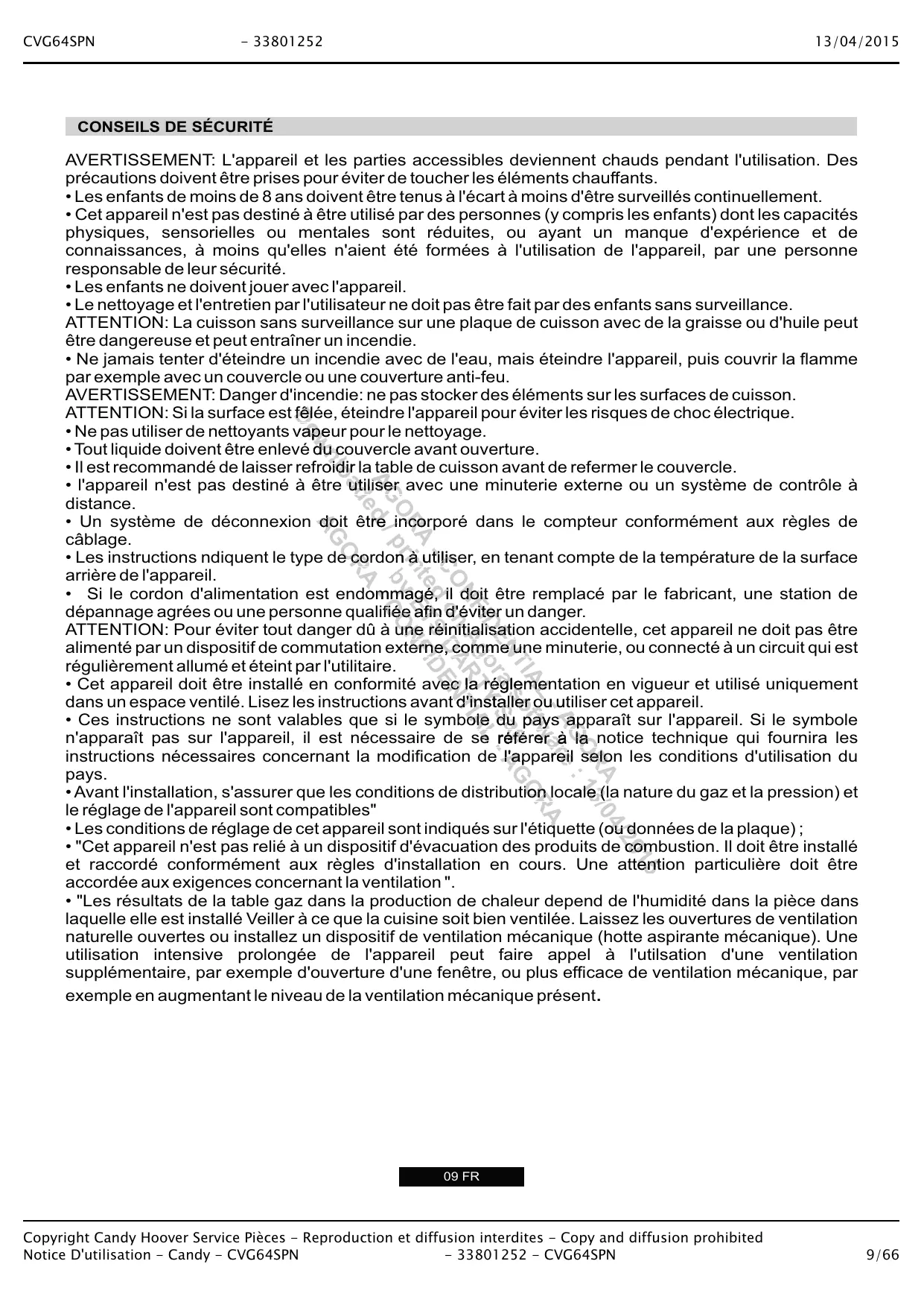 - "Les résultats de la table gaz dans la production de chaleur depend de l'humidité dans la pièce dans laquelle elle est installé Veiller à ce que la cuisine soit bien ventilée. Laissez les ouvertures de ventilation naturelle ouvertes ou installez un dispositif de ventilation mécanique (hotte aspirante mécanique). Une utilisation intensive prolongée de l'appareil peut faire appel à l'utilsation d'une ventilation supplémentaire, par exemple d'ouverture d'une fenêtre, ou plus efficace de ventilation mécanique, par exemple en augmentant le niveau de la ventilation mécanique présent. 09 FR Copyright Candy Hoover Service Pièces - Reproduction et diffusion interdites - Copy and diffusion prohibited Notice D'utilisation - Candy - CVG64SPN
