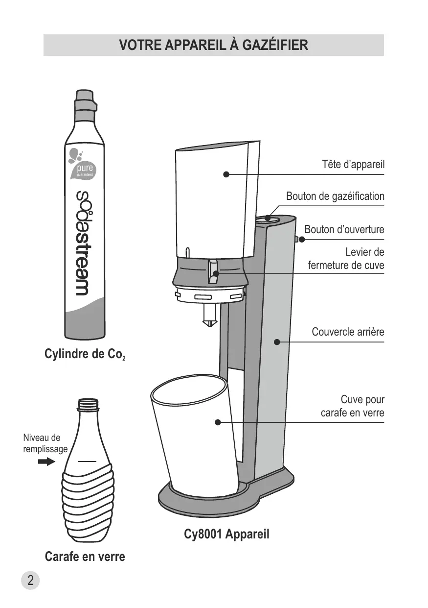 Cher client Merci d’avoir bien voulu acquérir l’appareil Soda-club CY8001. Désormais, vous pouvez créer votre eau gazeuse et vos sodas maison en quelques secondes. C’est aussi simple que ça. Vous rejoignez des millions d’utilisateurs dans le monde entier qui aident à préserver l’environnement tout en faisant des économies. ! Avec votre nouveau Soda-club, vous aiderez la planète à diminuer les bouteilles en plastique, et les déchets plastiques et à réduire les transports inutiles de boissons en bouteilles. Et plus vous l’utiliserez, plus vous ferez des économies. Nous vous invitons à déguster votre eau gazeuse et sodas faits maison. Découvrez nos différents concentrés vous permettant de réaliser d’excellentes boissons pétillantes. Veuillez lire attentivement ces instructions avant d’utiliser l’appareil Soda-club.