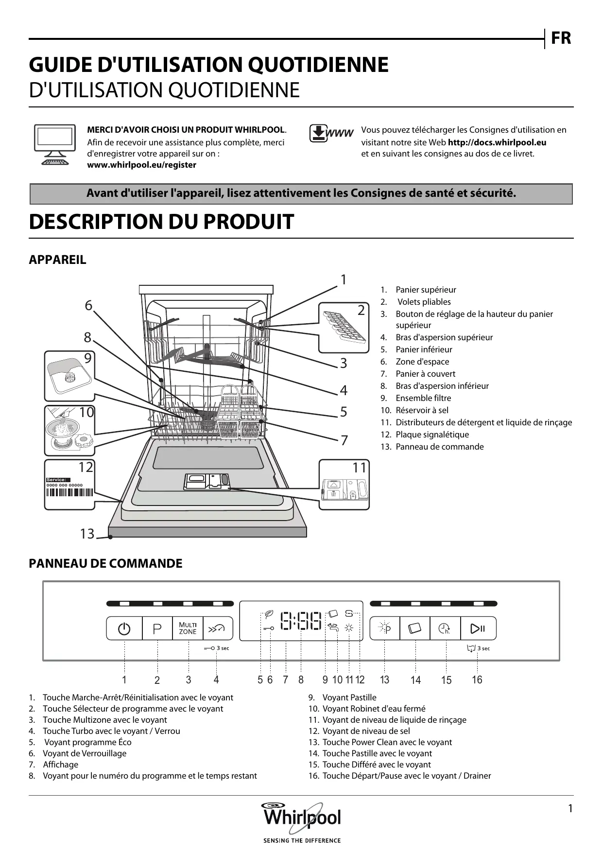 D'UTILISATION QUOTIDIENNE MERCI D'AVOIR CHOISI UN PRODUIT WHIRLPOOL. Afin de recevoir une assistance plus complète, merci d'enregistrer votre appareil sur on : www.whirlpool.eu/register Vous pouvez télécharger les Consignes d'utilisation en visitant notre site Web http://docs.whirlpool.eu et en suivant les consignes au dos de ce livret. Avant d'utiliser l'appareil, lisez attentivement les Consignes de santé et sécurité.
