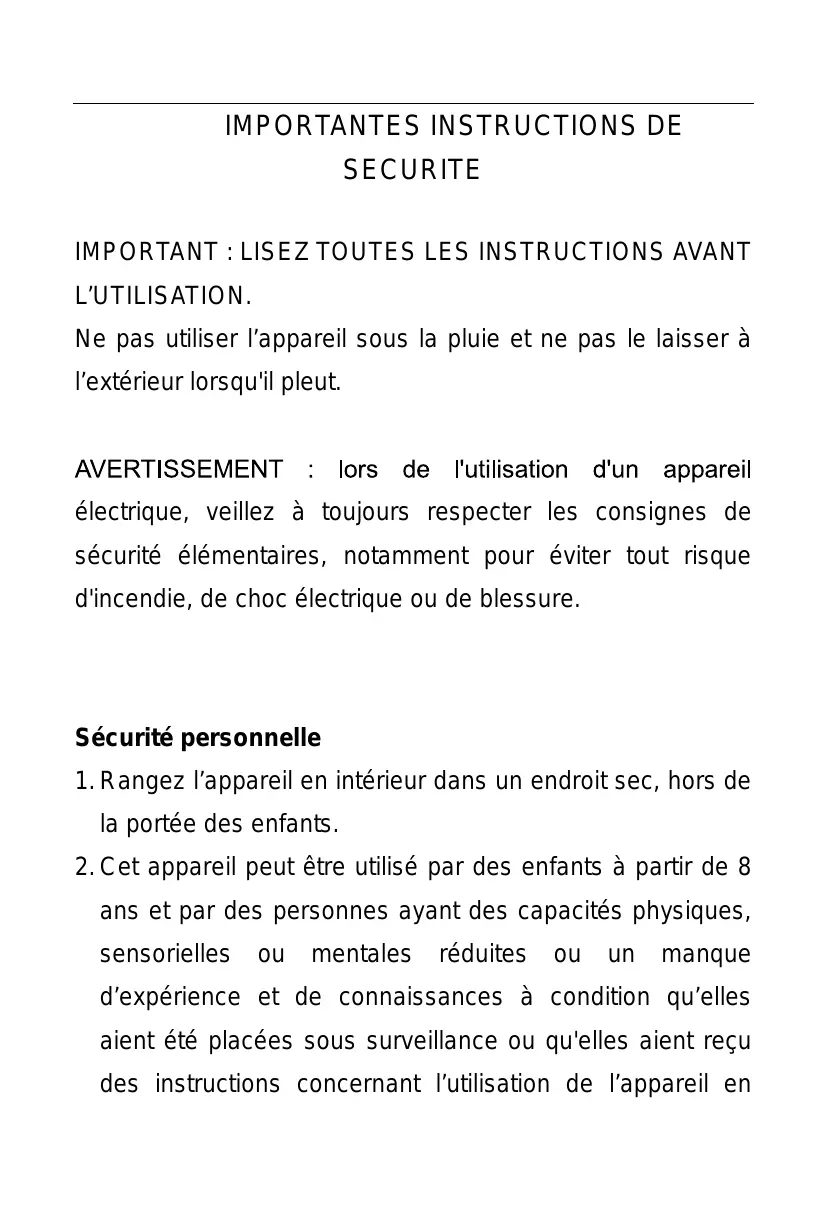 Sécurité personnelle 1. Rangez l’appareil en intérieur dans un endroit sec, hors de la portée des enfants. 2. Cet appareil peut être utilisé par des enfants à partir de 8 ans et par des personnes ayant des capacités physiques, sensorielles