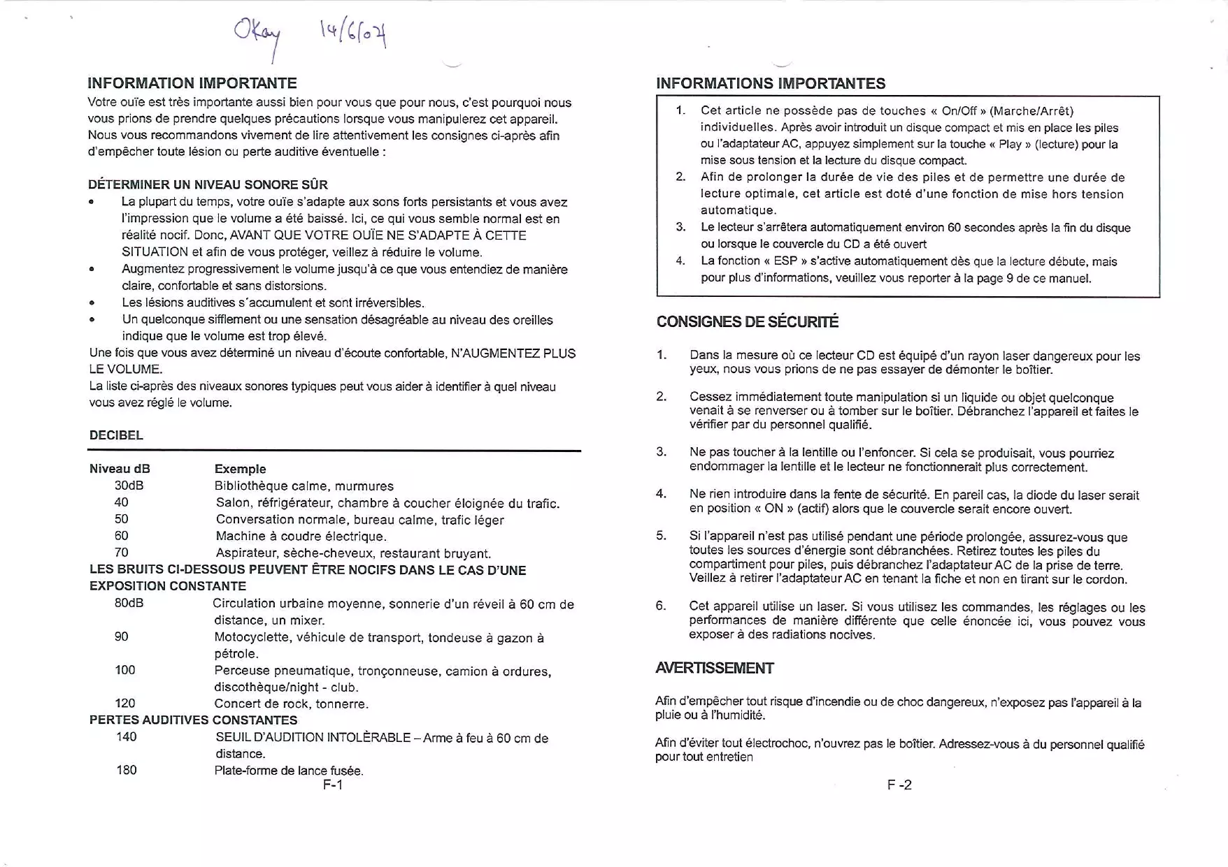 Votre ouie est très importante aussi bien pour vous que pour nous, c'est pour quoi nous给您 prions de prendre quelques précautions lorsque vous manipulerez cet apparéil. Nous vous recommendons vivement de dire attentivement les consignes ci-après afin d'empêcher toute lésion ou perte auditive eventuelle :