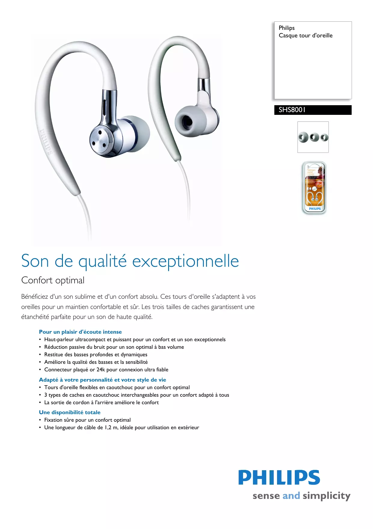 - Une longueur de câble de 1,2 m, idéale pour utilisation en extérieur SHS8001/00 Casque tour d'oreille Caractéristiques Points forts du produit Son