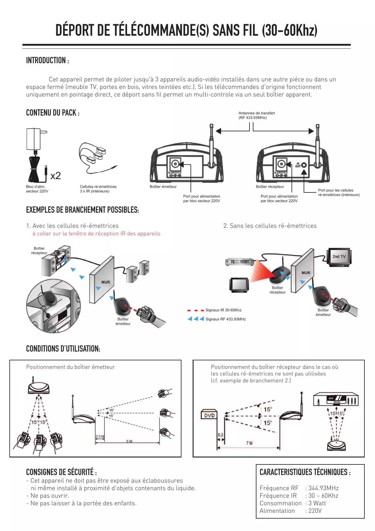 DÉPORT DE TÉLÉCOMMANDE(S) SANS FIL (30-60Khz) INTRODUCTION : Cet appareil permet de piloter jusqu'à 3 appareils audio-vidéo installés dans une autre piéce ou dans un espace fermé (meuble TV, portes en bois, vitres teintées etc.). Si les télécommandes d'origine fonctionnent uniquement en pointage direct, ce déport sans fil permet un multi-controle via un seul boîtier apparent.