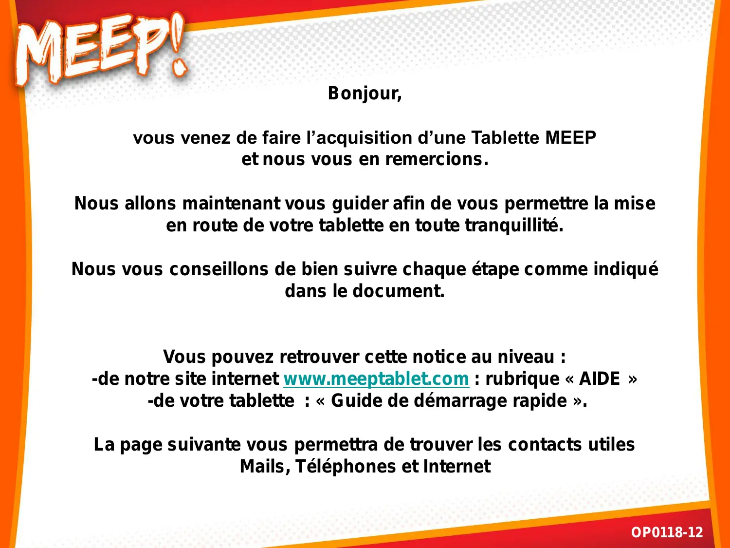 OP0118-12 Categories 2012 Nov 30th, 2011 OP0118-12 Bonjour, vous venez de faire l’acquisition d’une Tablette MEEP et nous vous en remercions. Nous allons maintenant vous guider afin de vous permettre la mise en route de votre tablette en toute tranquillité. Nous vous conseillons de bien suivre chaque étape comme indiqué dans le document. Vous pouvez retrouver cette notice au niveau : -de notre site internet www.meeptablet.com : rubrique « AIDE » -de votre tablette : « Guide de démarrage rapide ». La page suivante vous permettra de trouver les contacts utiles Mails, Téléphones et Internet OP0118-12 Veuillez trouver ci-joint les contacts utiles pour vous venir en aide : mails, téléphones et internet