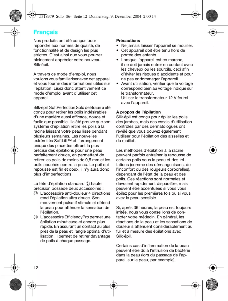 5318379_Solo_S6- Seite 12 Donnerstag, 9. Dezember 2004 2:00 14 Français Nos produits ont été conçus pour répondre aux normes de qualité, de fonctionnalité et de design les plus strictes. C’est ainsi que vous pourrez pleinement apprécier votre nouveau Silk·épil. A travers ce mode d’emploi, nous voulons vous familiariser avec cet appareil et vous fournir des informations utiles sur l’épilation. Lisez donc attentivement ce mode d’emploi avant d’utiliser cet appareil. Silk·épill SoftPerfection Solo de Braun a été conçu pour retirer les poils indésirables d’une manière aussi efficace, douce et facile que possible. Il a été prouvé que son système d’épilation retire les poils à la racine laissant votre peau lisse pendant plusieurs semaines. Les nouvelles extrémités SoftLift™ et l’arrangement unique des pincettes offrent la plus précise des épilations pour une peau parfaitement douce, en permettant de retirer les poils de moins de 0,5 mm et les poils couchés contre la peau. Le poil qui repousse est fin et doux, il n’y aura donc plus d’imperfections. La tête d’épilation standard 2 haute précision possède deux accessoires : 1a L’accessoire anti-douleur 4 directions rend l’épilation ultra douce. Son mouvement pulsatif stimule et détend la peau pour atténuer la sensation de l’épilation. 1b L’accessoire EfficiencyPro permet une épilation minutieuse et encore plus rapide. En assurant un contact au plus près de la peau et l’angle optimal d’utilisation, il permet de retirer davantage de poils à chaque passage. Précautions