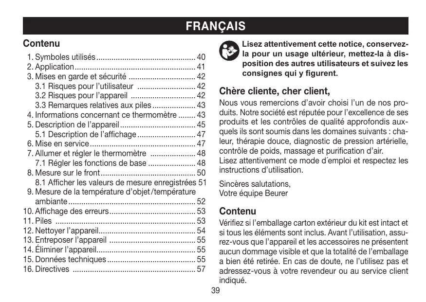 4. Informations concernant ce thermomètre 43 5. Description de l’appareil 45 5.1 Description de l’affichage 47 6. Mise en service 47 7. Allumer et régler le thermomètre 48 7.1 Régler les fonctions de base 48 8. Mesure sur le front 50 8.1 Afficher les valeurs de mesure enregistrées .51 9. Mesure de la température d’objet / température ambiante 52 10. Affichage des erreurs 53 11. Piles 53 12. Nettoyer l’appareil 54 Lisez attentivement ce mode d´emploi et respectez les instructions d’utilisation. Sincères salutations, Votre équipe Beurer