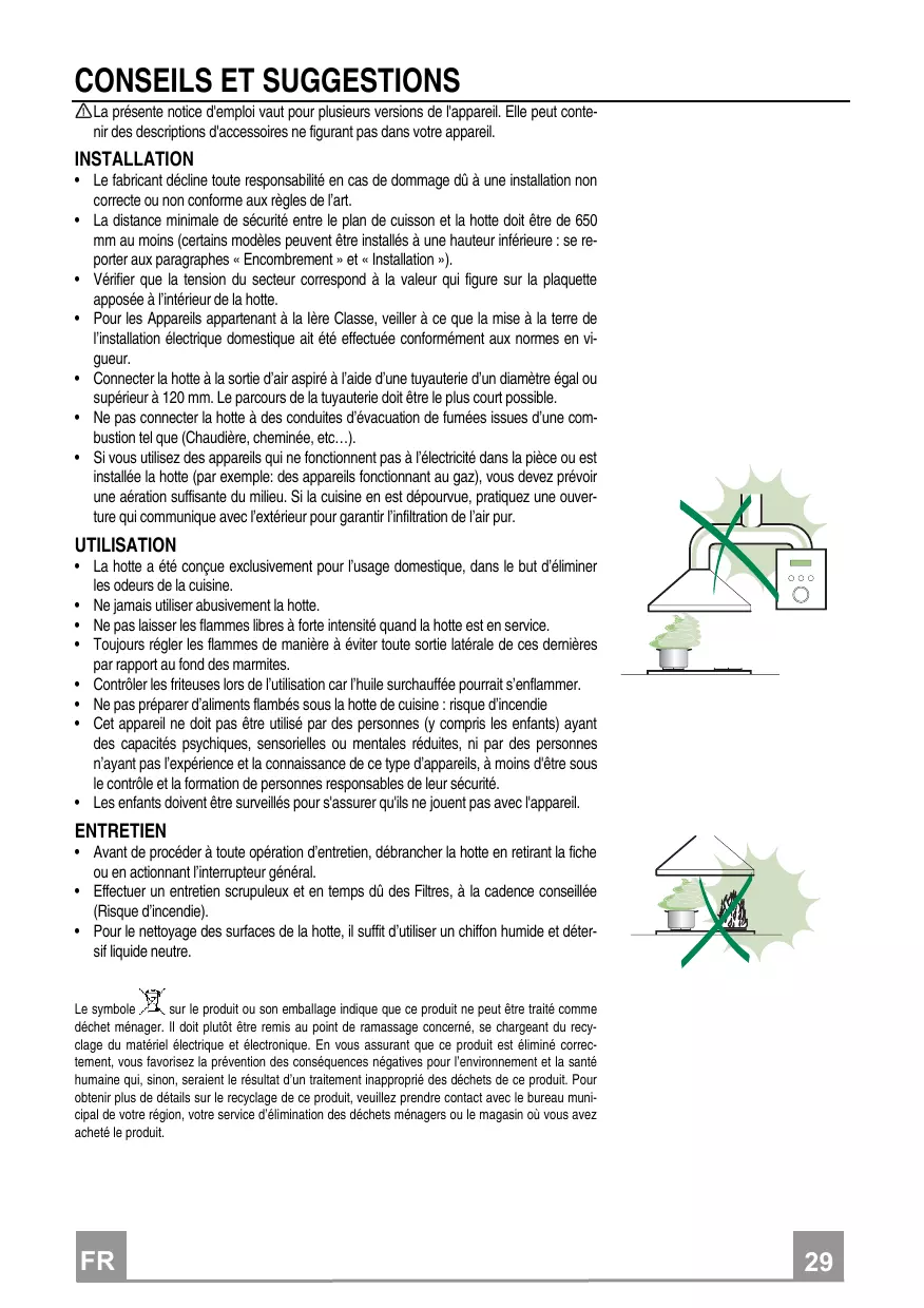- Ne pas préparer d’aliments flambés sous la hotte de cuisine : risque d’incendie