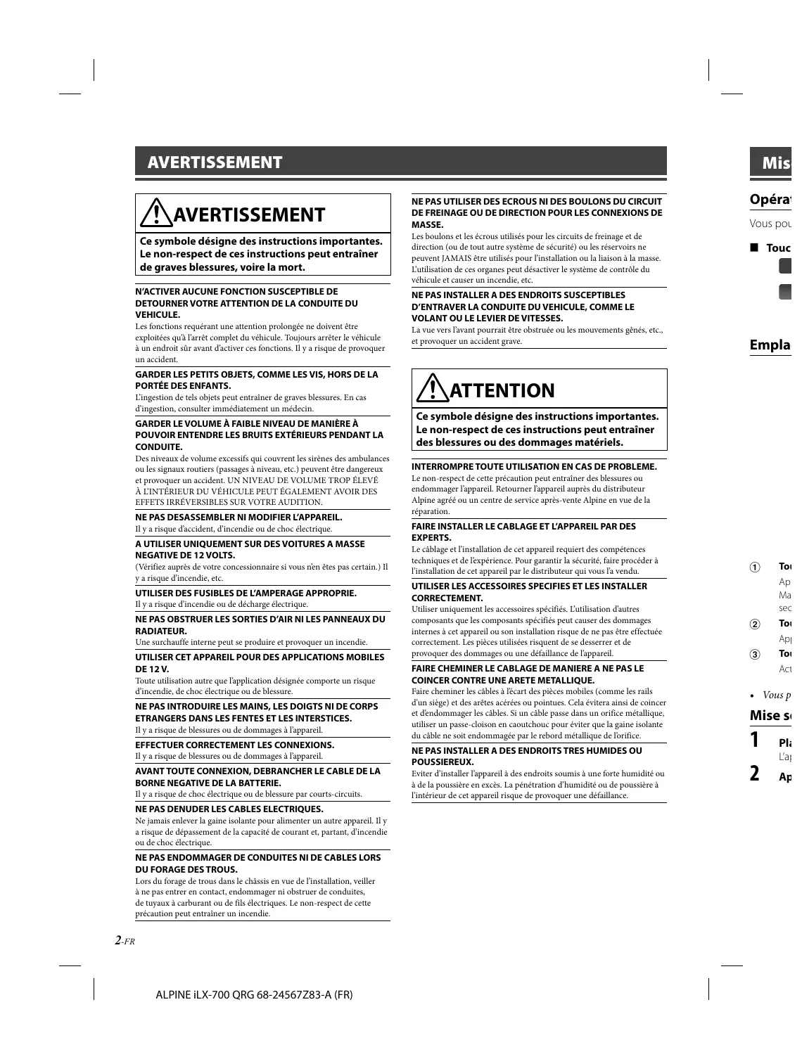 Pour plus de détails sur toutes les fonctions, consultez le mode d’emploi disponible sur le site http://www.alpine-europe.com. Le cas échéant, un revendeur ALPINE peut vous fournir une copie imprimée du mode d’emploi disponible sur le site. 1-FR AVERTISSEMENT Ce symbole désigne des instructions importantes. Le non-respect de ces instructions peut entraîner de graves blessures, voire la mort.