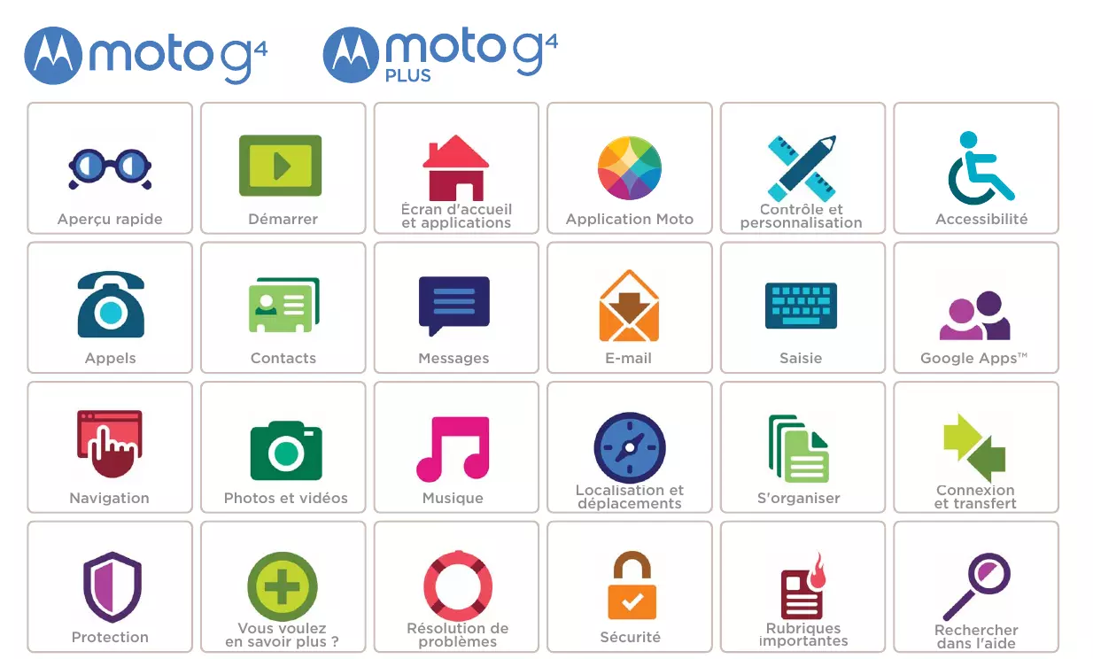 Moto G Aperçu rapide Démarrer Écran d'accueil et applications Application Moto Contrôle t ôl ett personnalisation Appels Contacts Messages E-mail Saisie Google Apps™ Navigation Photos et vidéos Musique Localisation et déplacements S'organiser Connexion et transfert Protection Vous voulez en savoir plus ? Rubriques importantes Rechercher dans l'aide Résolution de problèmes Sécurité Accessibilité Aperçu rapide En un clin d'œil Aperçu rapide Présentation du téléphone Rubriques importantes Présentation du téléphone Trucs et astuces C'est parti ! Nous allons vous guider tout au long du démarrage et présenter les fonctions de votre téléphone.