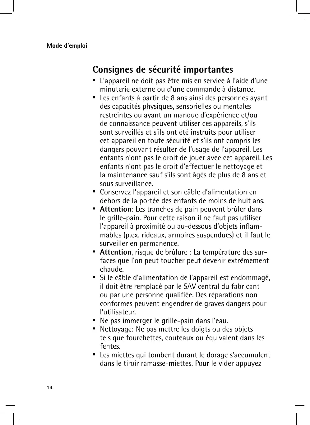 - Ne jamais faire fonctionner le grille-pain sans surveillance.