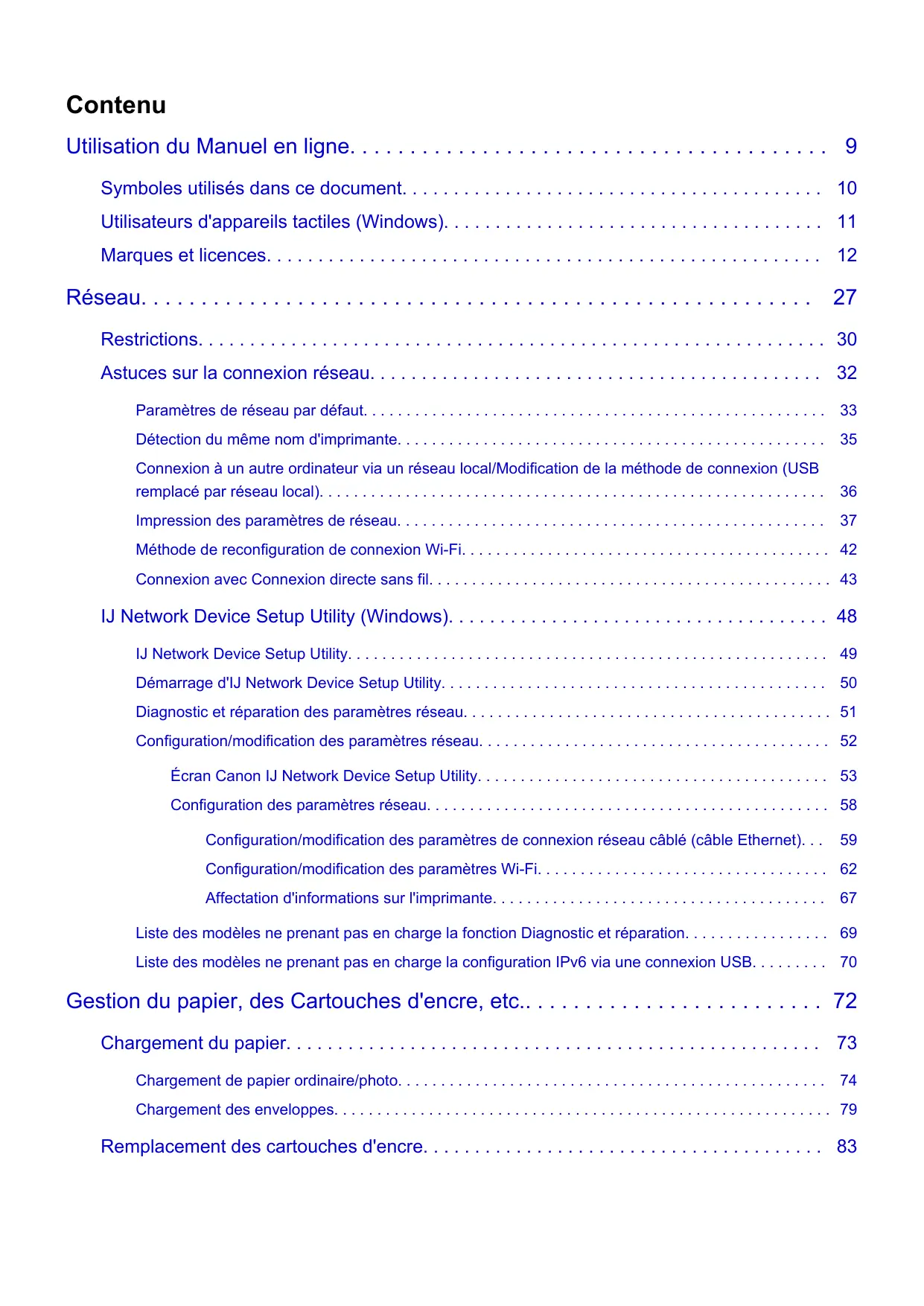 IJ Network Device Setup Utility (Windows). . . . . . . . . . . . . . . . . . . . . . . . . . . . . . . . . . . . . 48 IJ Network Device Setup Utility. . . . . . . . . . . . . . . . . . . . . . . . . . . . . . . . . . . . . . . . . . . . . . . . . . . . . . . . 49 Démarrage d'IJ Network Device Setup Utility. . . . . . . . . . . . . . . . . . . . . . . . . . . . . . . . . . . . . . . . . . . . . 50 Diagnostic et réparation des paramètres réseau. . . . . . . . . . . . . . . . . . . . . . . . . . . . . . . . . . . . . . . . . . . 51 Configuration/modification des paramètres réseau. . . . . . . . . . . . . . . . . . . . . . . . . . . . . . . . . . . . . . . . . 52 Écran Canon IJ Network Device Setup Utility. . . . . . . . . . . . . . . . . . . . . . . . . . . . . . . . . . . . . . . . . 53 Configuration des paramètres réseau. . . . . . . . . . . . . . . . . . . . . . . . . . . . . . . . . . . . . . . . . . . . . . . 58 Configuration/modification des paramètres de connexion réseau câblé (câble Ethernet). . .