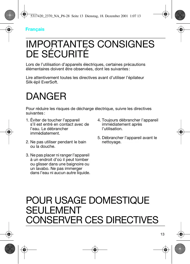 5317420_2370_NA_P6-28 Seite 14 Dienstag, 18. Dezember 2001 1:07 13 AVERTISSEMENT Pour réduire les risques de brûlure, d’incendie, de décharge électrique ou de blessure, suivre les directives suivantes :
