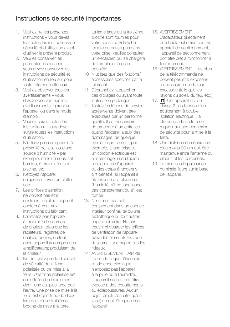 15. AVERTISSEMENT : L'adaptateur directement enfichable est utilisé comme appareil de sectionnement, l'appareil de sectionnement doit être prêt à fonctionner à tout moment. 16. AVERTISSEMENT : Les piles de la télécommande ne doivent pas être exposées à une source de chaleur excessive (telle que les rayons du soleil, du feu, etc.). 17. Cet appareil est de classe 2 ou dispose d’un équipement à double isolation électrique. Il a été conçu de sorte à ne requérir aucune connexion de sécurité pour la mise à la terre. 18. Une distance de séparation d’au moins 20 cm doit être maintenue entre l’antenne du produit et les personnes. 19. La mention de puissance nominale figure sur la base de l’appareil.