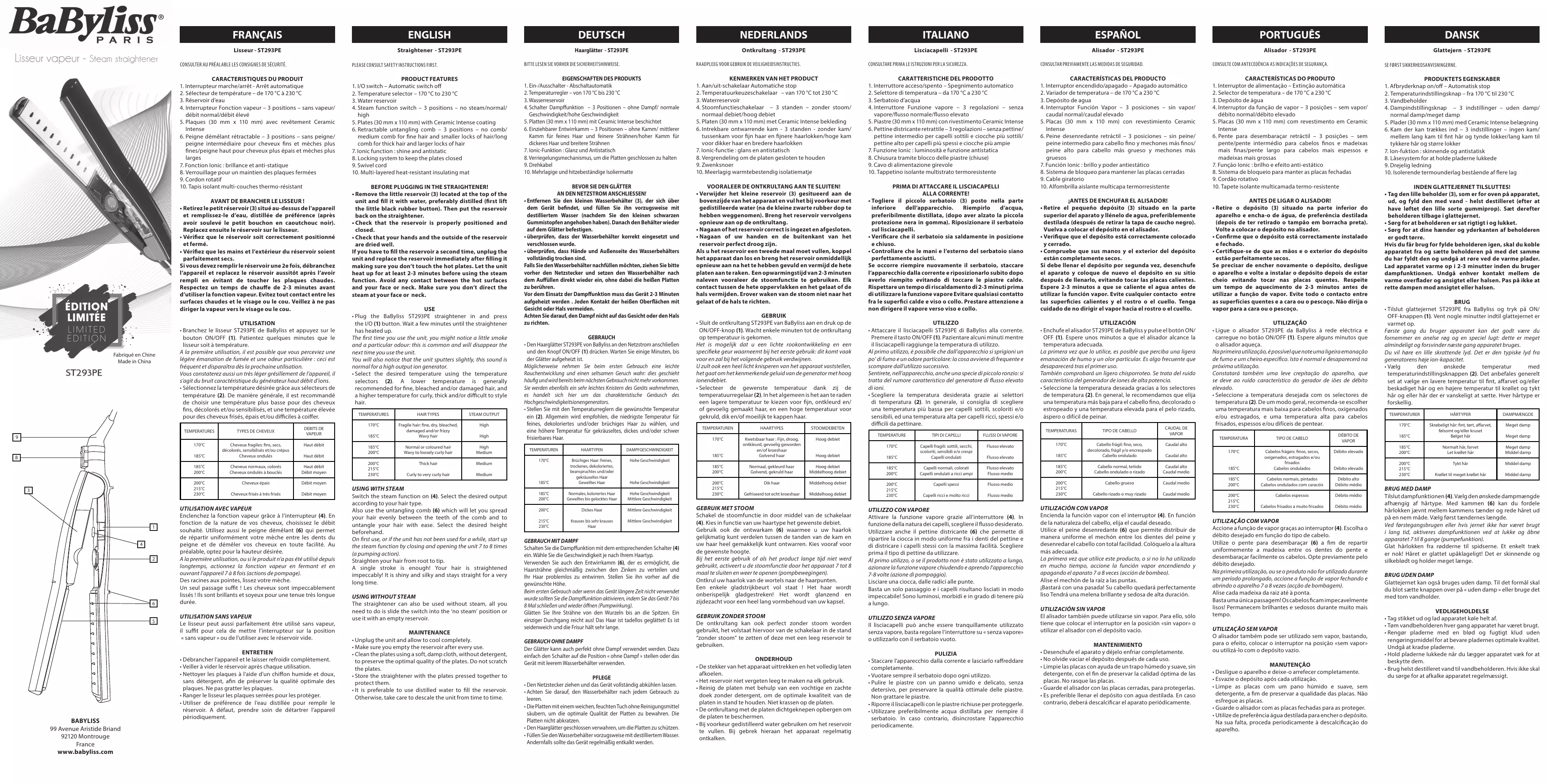 CARACTERISTIQUES DU PRODUIT 1. Interrupteur marche/arrêt - Arrêt automatique 2. Sélecteur de température – de 170 °C à 230 °C 3. Réservoir d’eau 4. Interrupteur Fonction vapeur – 3 positions – sans vapeur/ débit normal/débit élevé 5. Plaques (30 mm x 110 mm) avec revêtement Ceramic Intense 6. Peigne démêlant rétractable – 3 positions – sans peigne/ peigne intermédiaire pour cheveux fins et mèches plus fines/peigne haut pour cheveux plus épais et mèches plus larges 7. Fonction Ionic : brillance et anti-statique 8. V errouillage pour un maintien des plaques fermées 9. Cordon rotatif 10. T apis isolant multi-couches thermo-résistant AVANT DE BRANCHER LE LISSEUR ! • Retirez le petit réservoir (3) situé au-dessus de l’appareil et remplissez-le d’eau, distillée de préférence (après avoir soulevé le petit bouchon en caoutchouc noir). Replacez ensuite le réservoir sur le lisseur. • Vérifiez que le réservoir soit correctement positionné et fermé. • Vérifiez que les mains et l’extérieur du réservoir soient parfaitement secs. Si vous devez remplir le réservoir une 2e fois, débranchez l’appareil et replacez le réservoir aussitôt après l’avoir rempli en évitant de toucher les plaques chaudes. Respectez un temps de chauffe de 2-3 minutes avant d’utiliser la fonction vapeur. Evitez tout contact entre les surfaces chaudes et le visage ou le cou. Veillez à ne pas diriger la vapeur vers le visage ou le cou.
