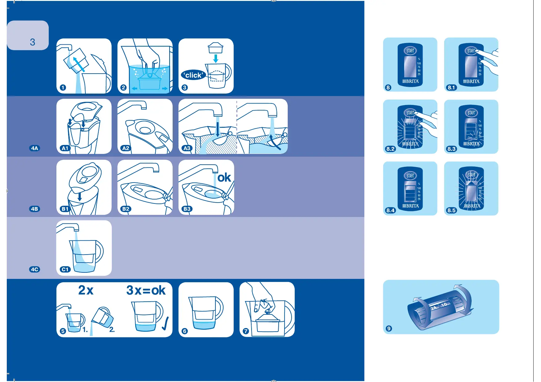 Si vous avez acheté un filtré à eau BRITA muni d'un couvercle à clapet de replissage automatique, veuillez suivre les instructions données aux étapes A1 à A3.