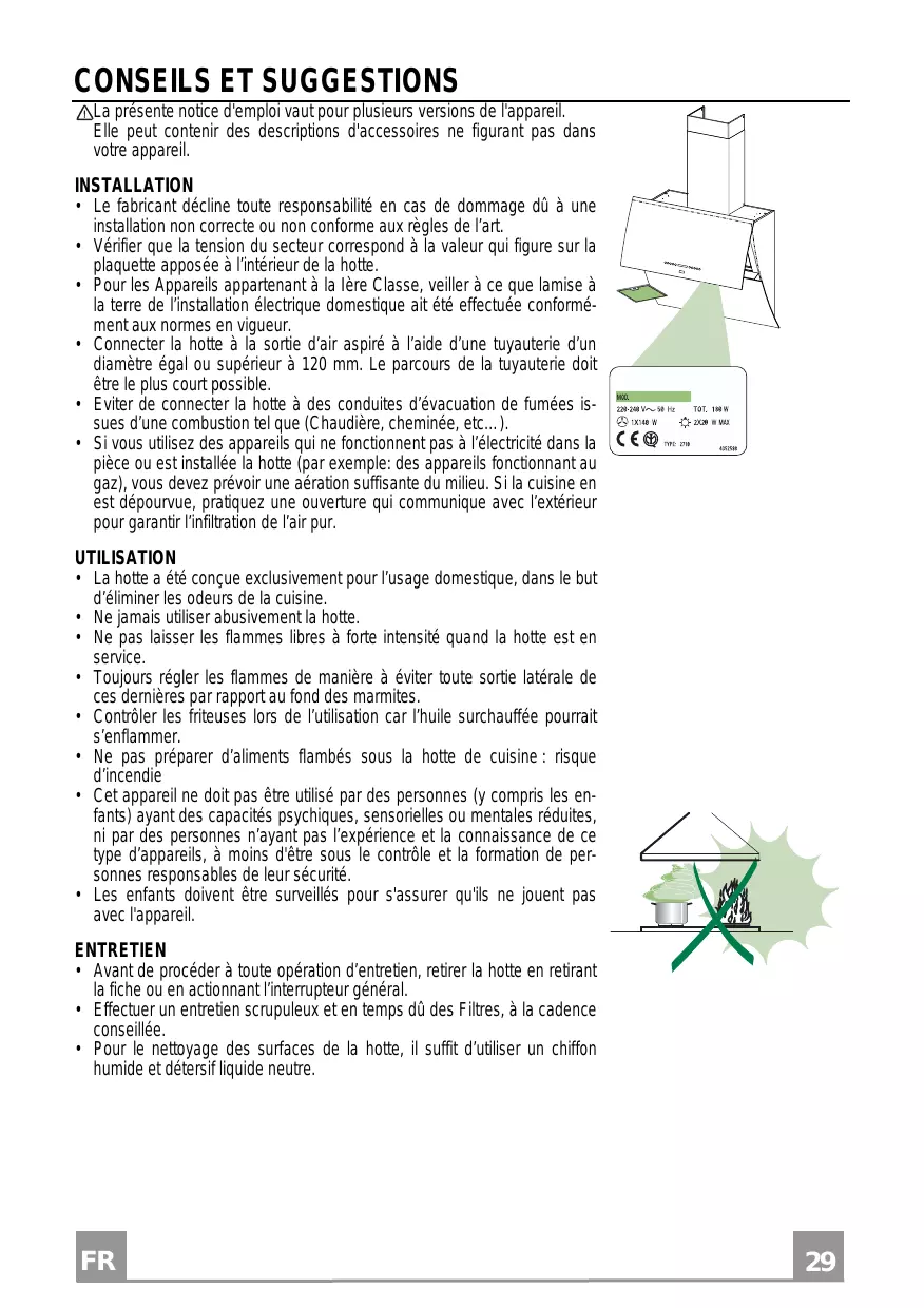 - Ne pas préparer d’aliments flambés sous la hotte de cuisine : risque d’incendie