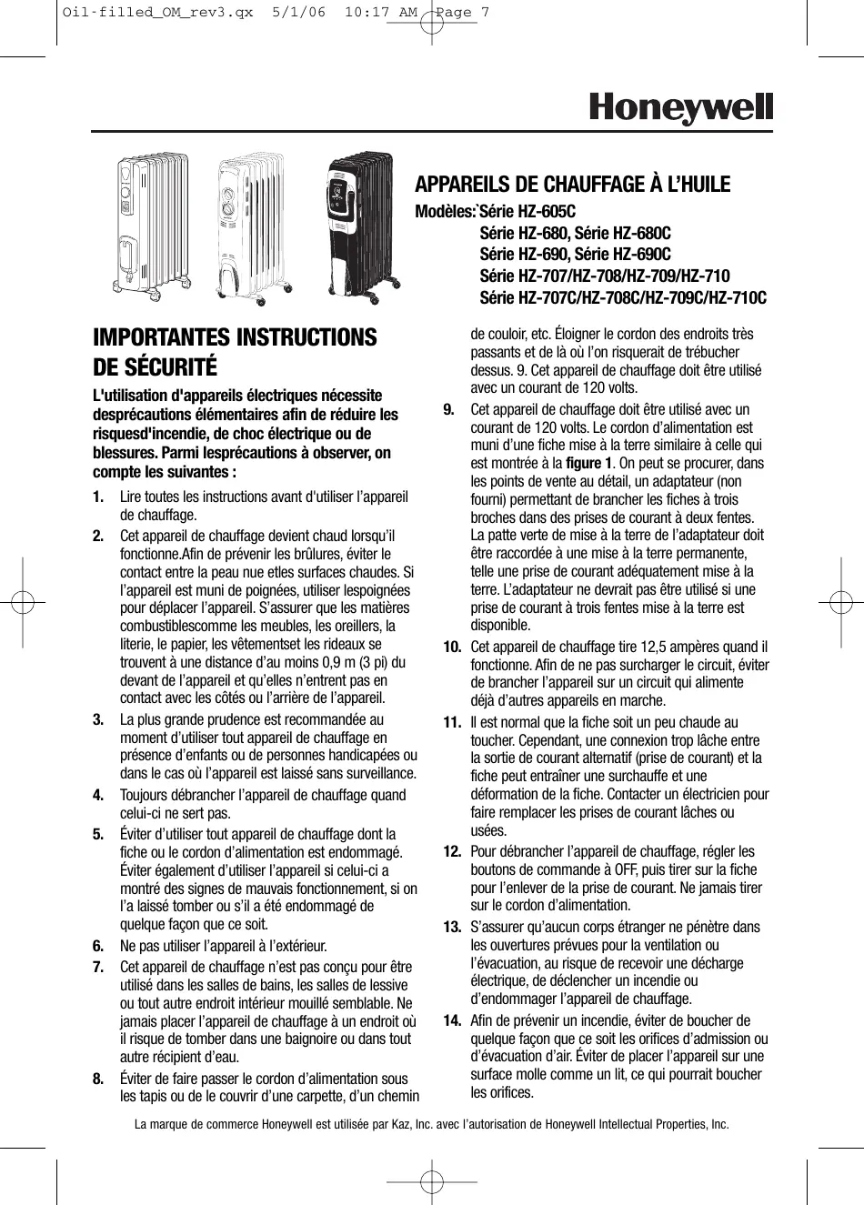 Série HZ-707C/HZ-708C/HZ-709C/HZ-710C IMPORTANTES INSTRUCTIONS DE SÉCURITÉ L'utilisation d'appareils électriques nécessite desprécautions élémentaires afin de réduire les risquesd'incendie, de choc électrique ou de blessures. Parmi lesprécautions à observer, on compte les suivantes : 1. Lire toutes les instructions avant d'utiliser l’appareil de chauffage. 2. Cet appareil de chauffage devient chaud lorsqu’il fonctionne.Afin de prévenir les brûlures, éviter le contact entre la peau nue etles surfaces chaudes. Si l’appareil est muni de poignées, utiliser lespoignées pour déplacer l’appareil. S’assurer que les matières combustiblescomme les meubles, les oreillers, la literie, le papier, les vêtementset les rideaux se trouvent à une distance d’au moins 0,9 m (3 pi) du devant de l’appareil et qu’elles n’entrent pas en contact avec les côtés ou l’arrière de l’appareil. 3. La plus grande prudence est recommandée au moment d’utiliser tout appareil de chauffage en présence d’enfants ou de personnes handicapées ou dans le cas où l’appareil est laissé sans surveillance. 4. Toujours débrancher l’appareil de chauffage quand celui-ci ne sert pas. 5. Éviter d’utiliser tout appareil de chauffage dont la fiche ou le cordon d’alimentation est endommagé. Éviter également d’utiliser l’appareil si celui-ci a montré des signes de mauvais fonctionnement, si on l’a laissé tomber ou s’il a été endommagé de quelque façon que ce soit. 6. Ne pas utiliser l’appareil à l’extérieur. 7. Cet appareil de chauffage n’est pas conçu pour être utilisé dans les salles de bains, les salles de lessive ou tout autre endroit intérieur mouillé semblable. Ne jamais placer l’appareil de chauffage à un endroit où il risque de tomber dans une baignoire ou dans tout autre récipient d’eau. 8. Éviter de faire passer le cordon d’alimentation sous les tapis ou de le couvrir d’une carpette, d’un chemin