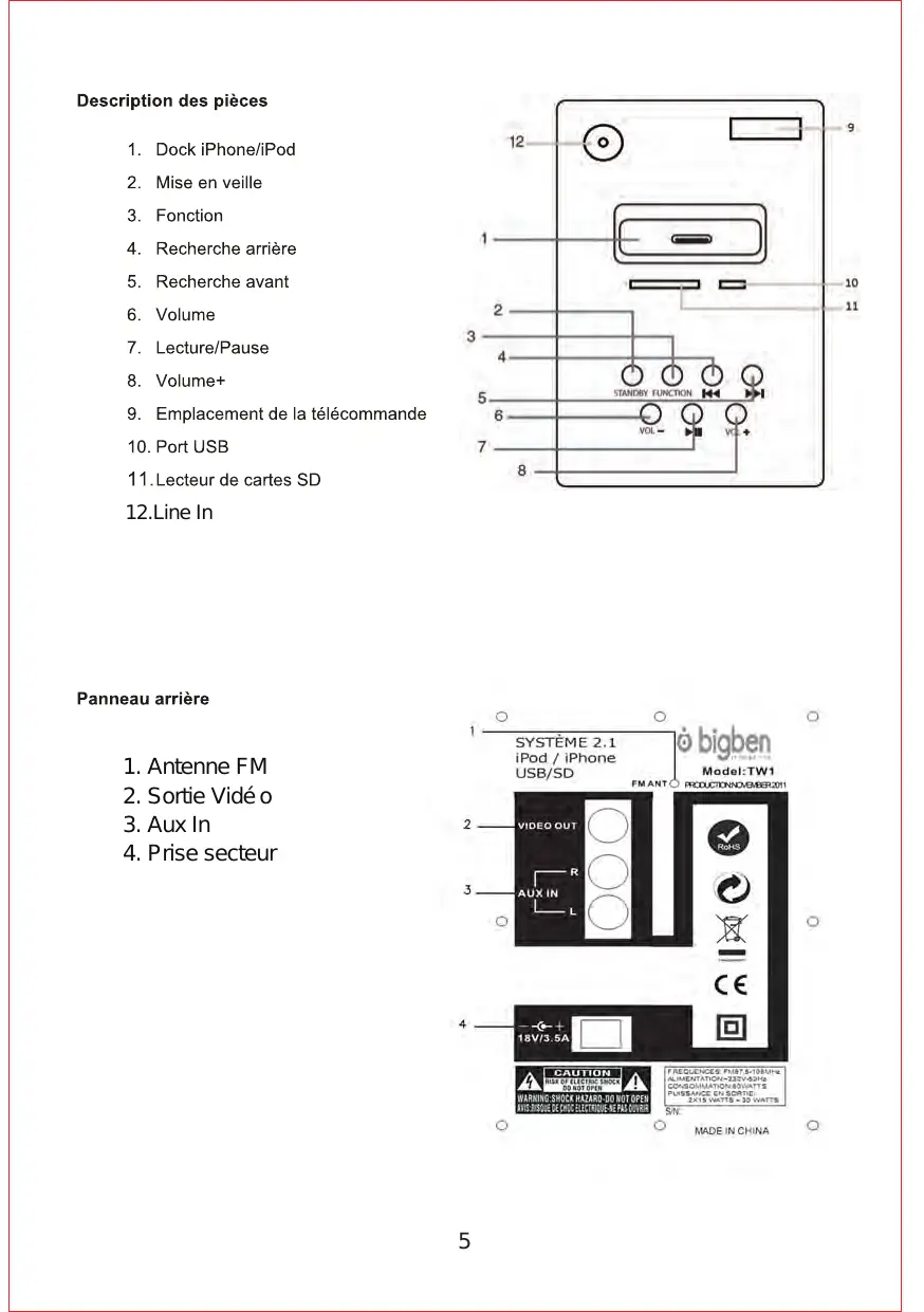 Line in Le message “Cet accessoire n’est pas optimisé pour cet iPhone” peut s’afficher lors de la connexion de votre iPhone. En aucun cas, votre iPhone ne sera endommagé, ce message est juste à titre d’information. Vous pouvez donc appuyer sur OK et écouter votre musique. Cela signifie que la réception 3G ou Wifi peut être plus faible lorsque l’iPhone est branché sur la tour. Bigben Interactive SA déclare par la présente que l'appareil TW1 est conforme aux exigences essentielles de la directive 1995/5/EC du Parlement européen et du Conseil du 9 Mars 1999 sur les équipements hertziens, les équipements terminaux de télécommunications et la reconnaissance mutuelle de leur conformité. Pour télécharger la version complète de cette déclaration, veuillez vous rendre sur notre site internet, http://www.bigben.eu/support dans la section Déclaration de conformité.