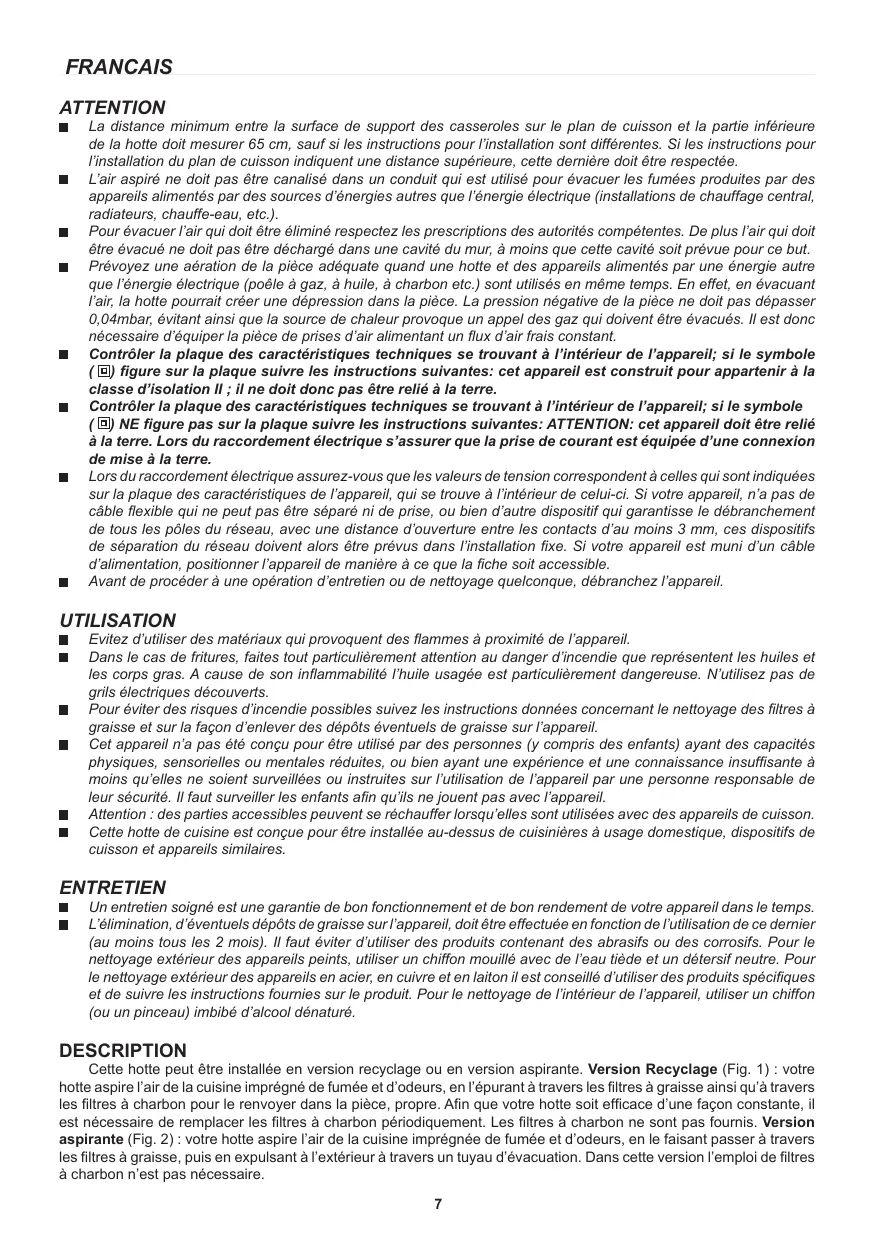 FRANCAIS ATTENTION La distance minimum entre la surface de support des casseroles sur le plan de cuisson et la partie inférieure de la hotte doit mesurer 65 cm, sauf si les instructions pour l’installation sont différentes. Si les instructions pour l’installation du plan de cuisson indiquent une distance supérieure, cette dernière doit être respectée. L’air aspiré ne doit pas être canalisé dans un conduit qui est utilisé pour évacuer les fumées produites par des appareils alimentés par des sources d’énergies autres que l’énergie électrique (installations de chauffage central, radiateurs, chauffe-eau, etc.). Pour évacuer l’air qui doit être éliminé respectez les prescriptions des autorités compétentes. De plus l’air qui doit être évacué ne doit pas être déchargé dans une cavité du mur, à moins que cette cavité soit prévue pour ce but. Prévoyez une aération de la pièce adéquate quand une hotte et des appareils alimentés par une énergie autre que l’énergie électrique (poêle à gaz, à huile, à charbon etc.) sont utilisés en même temps. En effet, en évacuant l’air, la hotte pourrait créer une dépression dans la pièce. La pression négative de la pièce ne doit pas dépasser 0,04mbar, évitant ainsi que la source de chaleur provoque un appel des gaz qui doivent être évacués. Il est donc nécessaire d’équiper la pièce de prises d’air alimentant un flux d’air frais constant. Contrôler la plaque des caractéristiques techniques se trouvant à l’intérieur de l’appareil; si le symbole ( ) figure sur la plaque suivre les instructions suivantes: cet appareil est construit pour appartenir à la classe d’isolation II ; il ne doit donc pas être relié à la terre. Contrôler la plaque des caractéristiques techniques se trouvant à l’intérieur de l’appareil; si le symbole ( ) NE figure pas sur la plaque suivre les instructions suivantes: ATTENTION: cet appareil doit être relié à la terre. Lors du raccordement électrique s’assurer que la prise de courant est équipée d’une connexion de mise à la terre. Lors du raccordement électrique assurez-vous que les valeurs de tension correspondent à celles qui sont indiquées sur la plaque des caractéristiques de l’appareil, qui se trouve à l’intérieur de celui-ci. Si votre appareil, n’a pas de câble flexible qui ne peut pas être séparé ni de prise, ou bien d’autre dispositif qui garantisse le débranchement de tous les pôles du réseau, avec une distance d’ouverture entre les contacts d’au moins 3 mm, ces dispositifs de séparation du réseau doivent alors être prévus dans l’installation fixe. Si votre appareil est muni d’un câble d’alimentation, positionner l’appareil de manière à ce que la fiche soit accessible. Avant de procéder à une opération d’entretien ou de nettoyage quelconque, débranchez l’appareil. UTILISATION Evitez d’utiliser des matériaux qui provoquent des flammes à proximité de l’appareil. Dans le cas de fritures, faites tout particulièrement attention au danger d’incendie que représentent les huiles et les corps gras. A cause de son inflammabilité l’huile usagée est particulièrement dangereuse. N’utilisez pas de grils électriques découverts. Pour éviter des risques d’incendie possibles suivez les instructions données concernant le nettoyage des filtres à graisse et sur la façon d’enlever des dépôts éventuels de graisse sur l’appareil. Cet appareil n’a pas été conçu pour être utilisé par des personnes (y compris des enfants) ayant des capacités physiques, sensorielles ou mentales réduites, ou bien ayant une expérience et une connaissance insuffisante à moins qu’elles ne soient surveillées ou instruites sur l’utilisation de l’appareil par une personne responsable de leur sécurité. Il faut surveiller les enfants afin qu’ils ne jouent pas avec l’appareil. Attention : des parties accessibles peuvent se réchauffer lorsqu’elles sont utilisées avec des appareils de cuisson. Cette hotte de cuisine est conçue pour être installée au-dessus de cuisinières à usage domestique, dispositifs de cuisson et appareils similaires. ENTRETIEN Un entretien soigné est une garantie de bon fonctionnement et de bon rendement de votre appareil dans le temps. L’élimination, d’éventuels dépôts de graisse sur l’appareil, doit être effectuée en fonction de l’utilisation de ce dernier (au moins tous les 2 mois). Il faut éviter d’utiliser des produits contenant des abrasifs ou des corrosifs. Pour le nettoyage extérieur des appareils peints, utiliser un chiffon mouillé avec de l’eau tiède et un détersif neutre. Pour le nettoyage extérieur des appareils en acier, en cuivre et en laiton il est conseillé d’utiliser des produits spécifiques et de suivre les instructions fournies sur le produit. Pour le nettoyage de l’intérieur de l’appareil, utiliser un chiffon (ou un pinceau) imbibé d’alcool dénaturé. DESCRIPTION Cette hotte peut être installée en version recyclage ou en version aspirante. Version Recyclage (Fig. 1) : votre hotte aspire l’air de la cuisine imprégné de fumée et d’odeurs, en l’épurant à travers les filtres à graisse ainsi qu’à travers les filtres à charbon pour le renvoyer dans la pièce, propre. Afin que votre hotte soit efficace d’une façon constante, il est nécessaire de remplacer les filtres à charbon périodiquement. Les filtres à charbon ne sont pas fournis. Version aspirante (Fig. 2) : votre hotte aspire l’air de la cuisine imprégnée de fumée et d’odeurs, en le faisant passer à travers les filtres à graisse, puis en expulsant à l’extérieur à travers un tuyau d’évacuation. Dans cette version l’emploi de filtres à charbon n’est pas nécessaire.