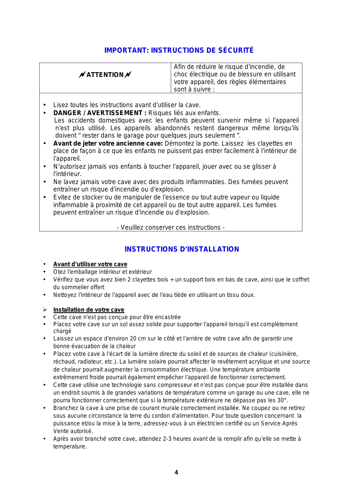 Lisez toutes les instructions avant d’utiliser la cave. DANGER / AVERTISSEMENT : Risques liés aux enfants. Les accidents domestiques avec les enfants peuvent survenir même si l’appareil n’est plus utilisé. Les appareils abandonnés restent dangereux même lorsqu’ils doivent “ rester dans le garage pour quelques jours seulement ”. Avant de jeter votre ancienne cave: Démontez la porte. Laissez les clayettes en place de façon à ce que les enfants ne puissent pas entrer facilement à l’intérieur de l’appareil. N’autorisez jamais vos enfants à toucher l’appareil, jouer avec ou se glisser à l’intérieur. Ne lavez jamais votre cave avec des produits inflammables. Des fumées peuvent entraîner un risque d’incendie ou d’explosion. Evitez de stocker ou de manipuler de l’essence ou tout autre vapeur ou liquide inflammable à proximité de cet appareil ou de tout autre appareil. Les fumées peuvent entraîner un risque d’incendie ou d’explosion. - Veuillez conserver ces instructions -