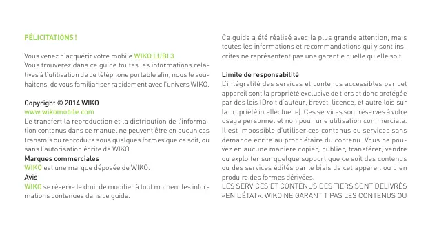 FÉLICITATIONS ! Vous venez d’acquérir votre mobile WIKO LUBI 3 Vous trouverez dans ce guide toutes les informations relatives à l’utilisation de ce téléphone portable afin, nous le souhaitons, de vous familiariser rapidement avec l’univers WIKO. Copyright © 2014 WIKO www.wikomobile.com Le transfert la reproduction et la distribution de l’information contenus dans ce manuel ne peuvent être en aucun cas transmis ou reproduits sous quelques formes que ce soit, ou sans l’autorisation écrite de WIKO. Marques commerciales WIKO est une marque déposée de WIKO. Avis WIKO se réserve le droit de modifier à tout moment les informations contenues dans ce guide. Ce guide a été réalisé avec la plus grande attention, mais toutes les informations et recommandations qui y sont inscrites ne représentent pas une garantie quelle qu’elle soit. Limite de responsabilité L’intégralité des services et contenus accessibles par cet appareil sont la propriété exclusive de tiers et donc protégée par des lois (Droit d’auteur, brevet, licence, et autre lois sur la propriété intellectuelle). Ces services sont réservés à votre usage personnel et non pour une utilisation commerciale. Il est impossible d’utiliser ces contenus ou services sans demande écrite au propriétaire du contenu. Vous ne pouvez en aucune manière copier, publier, transférer, vendre ou exploiter sur quelque support que ce soit des contenus ou des services édités par le biais de cet appareil ou d’en produire des formes dérivées. LES SERVICES ET CONTENUS DES TIERS SONT DELIVRÉS «EN L’ÉTAT». WIKO NE GARANTIT PAS LES CONTENUS OU SERVICES AINSI DELIVRÉS, QUE CE SOIT DE MANIERE EXPRESSE OU IMPLICITE, A QUELQUE FIN QUE CE SOIT AINSI QUE LES GARANTIES QUALITÉ MARCHANDE ET D’ADÉQUATION A UN USAGE PARTICULIER. WIKO N’ASSURE PAS LA GARANTIE DE L’EXACTITUDE, LA VALIDITÉ, LA LÉGALITE OU L’EXHAUSTIVITE DES CONTENUS OU SERVICES FOURNIS PAR CET APPAREIL. WIKO NE SERA PAS RESPONSABLE EN CAS DE NÉGLIGENCE, QUE CE SOIT AU NIVEAU DE LA RESPONSABILITÉ CONTRACTUELLE OU DÉLICTUELLE,