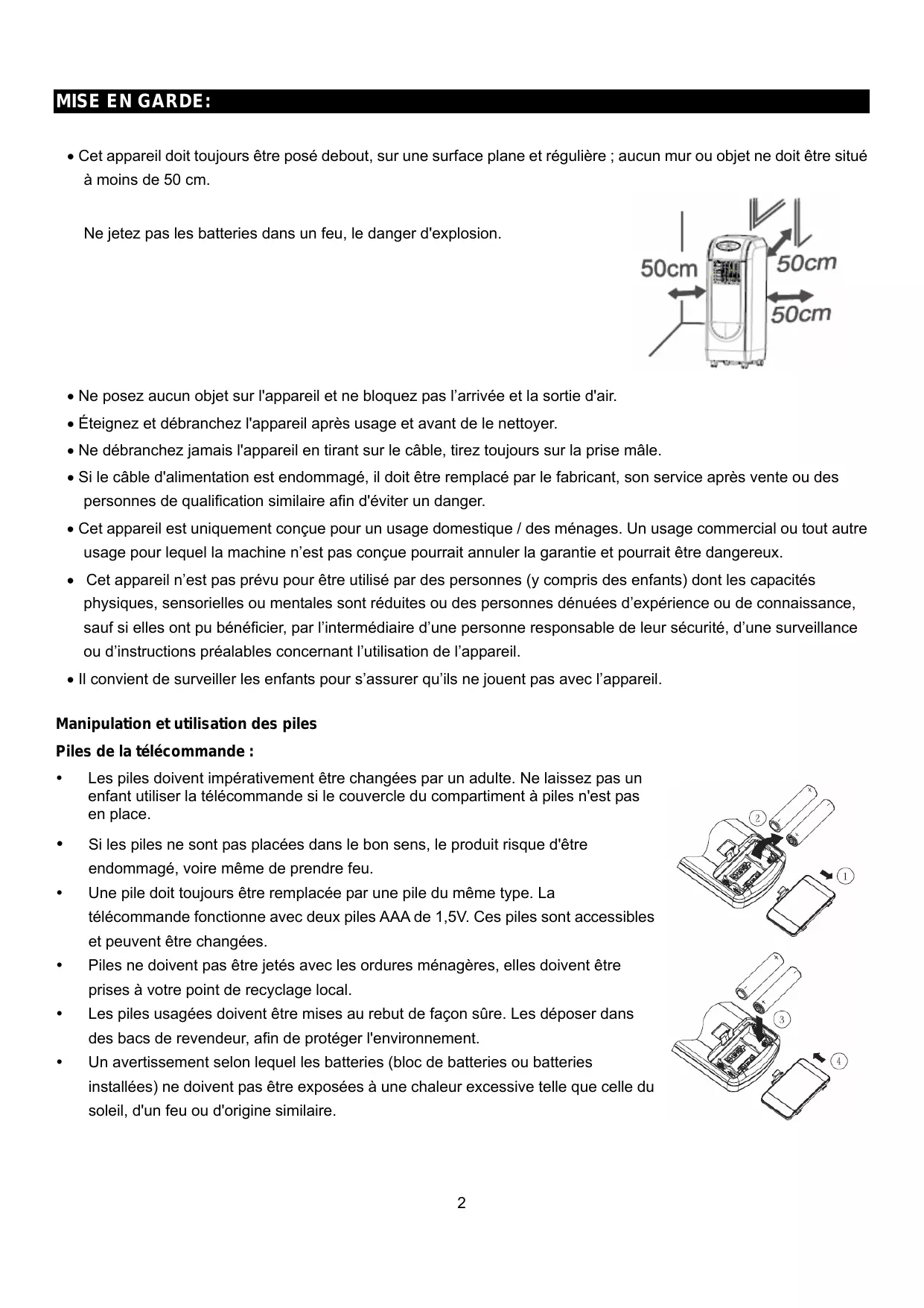 - Cet appareil doit toujours être posé debout, sur une surface plane et régulière ; aucun mur ou objet ne doit être situé à moins de 50 cm. Ne jetez pas les batteries dans un feu, le danger d'explosion.