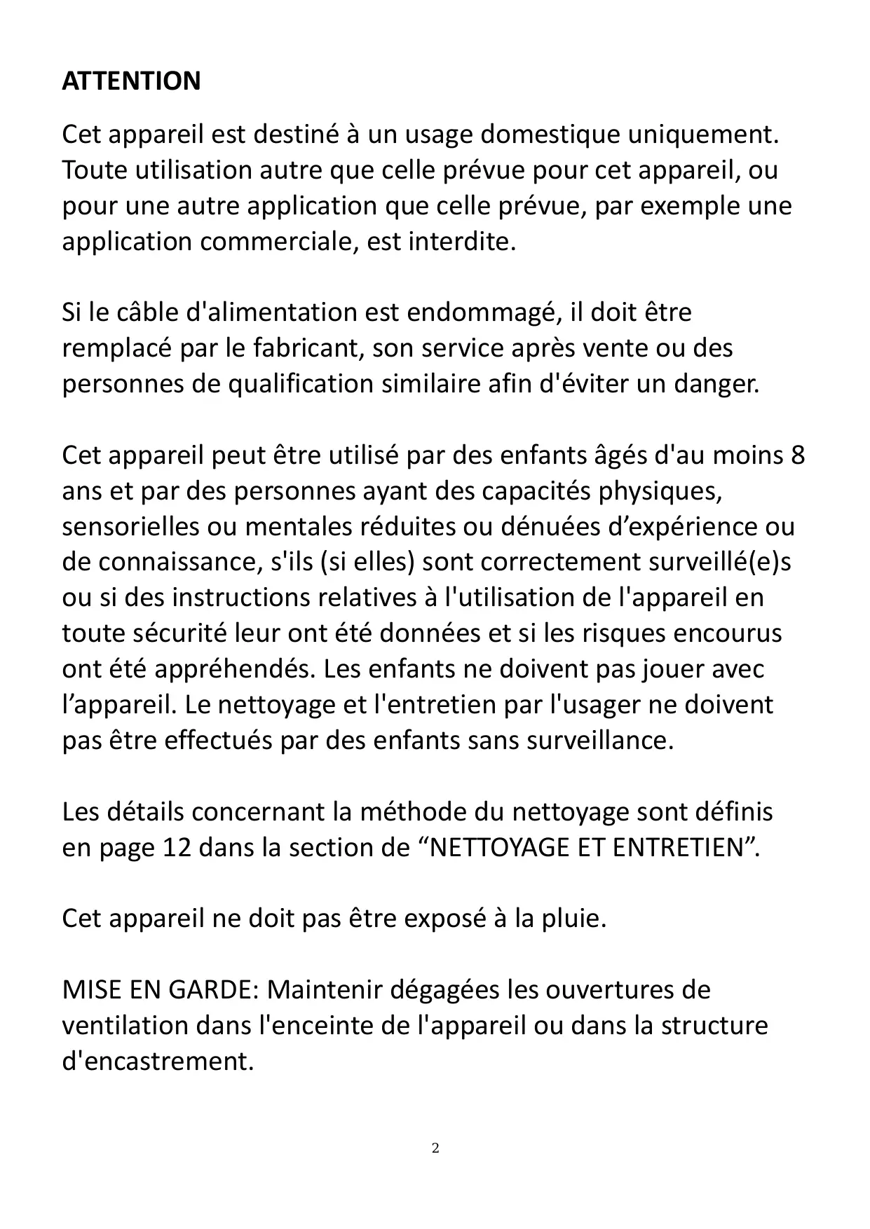 ATTENTION Cet appareil est destiné à un usage domestique uniquement. Toute utilisation autre que celle prévue pour cet appareil, ou pour une autre application que celle prévue, par exemple une application commerciale, est interdite. Si le câble d'alimentation est endommagé, il doit être remplacé par le fabricant, son service après vente ou des personnes de qualification similaire afin d'éviter un danger. Cet appareil peut être utilisé par des enfants âgés d'au moins 8 ans et par des personnes ayant des capacités physiques, sensorielles ou mentales réduites ou dénuées d’expérience ou de connaissance, s'ils (si elles) sont correctement surveillé(e)s ou si des instructions relatives à l'utilisation de l'appareil en toute sécurité leur ont été données et si les risques encourus ont été appréhendés. Les enfants ne doivent pas jouer avec l’appareil. Le nettoyage et l'entretien par l'usager ne doivent pas être effectués par des enfants sans surveillance. Les détails concernant la méthode du nettoyage sont définis en page 12 dans la section de “NETTOYAGE ET ENTRETIEN”. Cet appareil ne doit pas être exposé à la pluie. MISE EN GARDE: Maintenir dégagées les ouvertures de ventilation dans l'enceinte de l'appareil ou dans la structure d'encastrement.