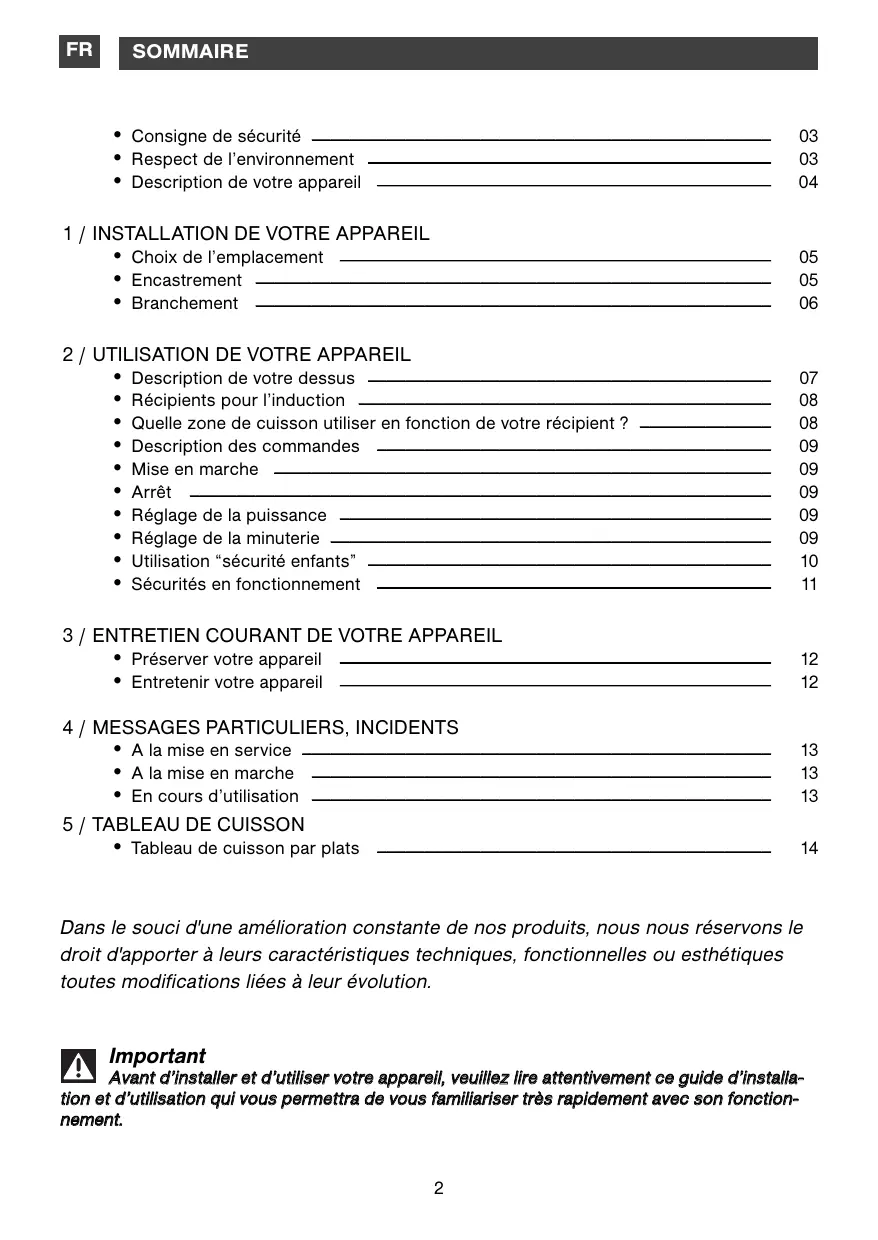 Dans le souci d'une amélioration constante de nos produits, nous nous réservons le droit d'apporter à leurs caractéristiques techniques, fonctionnelles ou esthétiques toutes modifications liées à leur évolution. Important Avant d’installer et d’utiliser votre appareil, veuillez lire attentivement ce guide d’installation et d’utilisation qui vous permettra de vous familiariser très rapidement avec son fonctionnement.