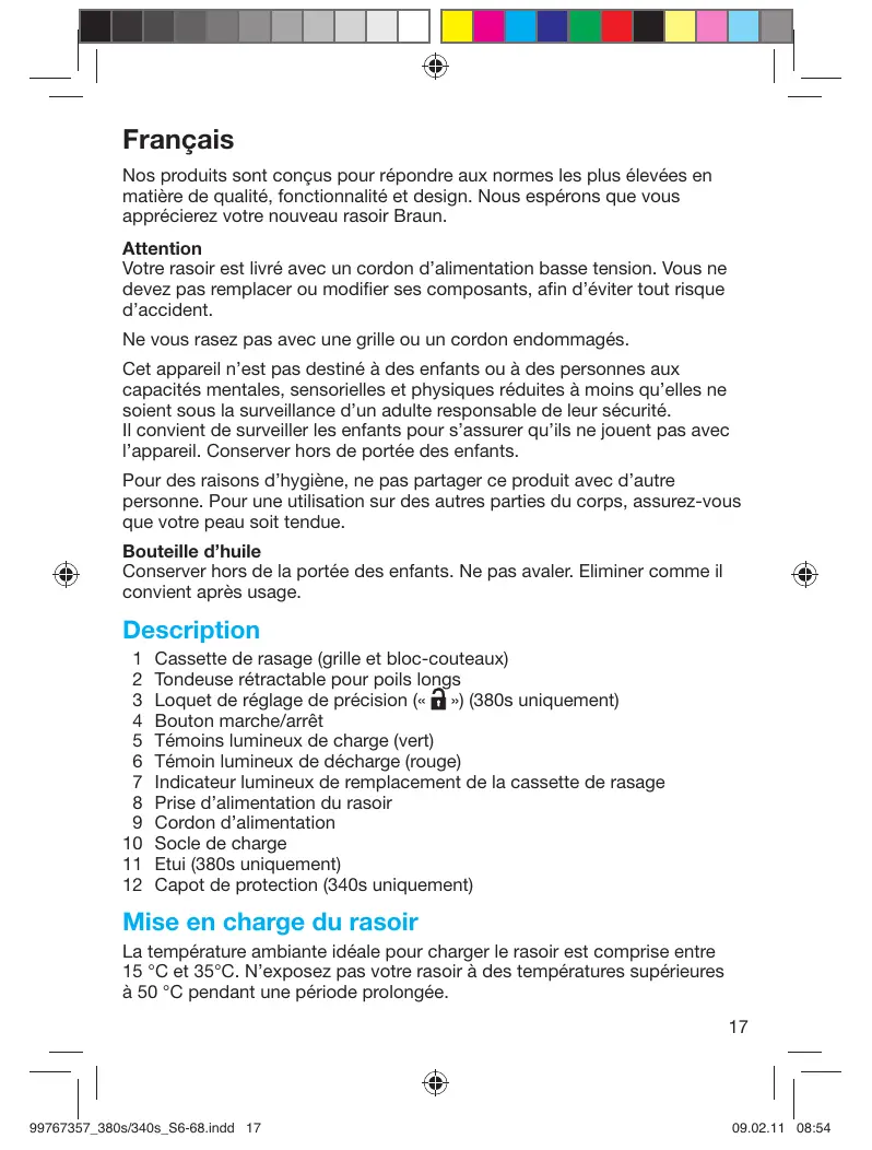 Français Nos produits sont conçus pour répondre aux normes les plus élevées en matière de qualité, fonctionnalité et design. Nous espérons que vous apprécierez votre nouveau rasoir Braun. Attention Votre rasoir est livré avec un cordon d’alimentation basse tension. Vous ne devez pas remplacer ou modifier ses composants, afin d’éviter tout risque d’accident. Ne vous rasez pas avec une grille ou un cordon endommagés. Cet appareil n’est pas destiné à des enfants ou à des personnes aux capacités mentales, sensorielles et physiques réduites à moins qu’elles ne soient sous la surveillance d’un adulte responsable de leur sécurité. Il convient de surveiller les enfants pour s’assurer qu’ils ne jouent pas avec l’appareil. Conserver hors de portée des enfants. Pour des raisons d’hygiène, ne pas partager ce produit avec d’autre personne. Pour une utilisation sur des autres parties du corps, assurez-vous que votre peau soit tendue. Bouteille d’huile Conserver hors de la portée des enfants. Ne pas avaler. Eliminer comme il convient après usage.