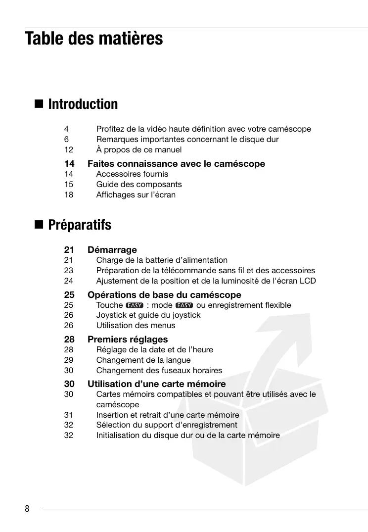 IMPORTANT : précautions relatives à l’utilisation du caméscope NOTES : rubriques additionnelles qui complètent les procédures de fonctionnement de base. • À VERIFIER : restrictions ou exigences concertant la fonction décrite. • : numéro de la page de référence dans ce manuel. Pour réaliser certaines opérations, vous devrez aussi vous reporter à d’autres manuels d’instructions. Cela est indiqué par les icônes suivantes : Reportez-vous au manuel d’instruction “Digital Video Software”, compris DVSD sur fichier PDF dans le CD-ROM fourni DIGITAL VIDEO Solution Disk. DW-100 Reportez-vous au manuel d’instructions du graveur DVD optionnel DW-100. • : texte qui s'applique uniquement au modèle indiqué dans l'icône. • Les termes suivants sont utilisés dans ce manuel : “Écran” fait référence à l'écran LCD et au viseur ( uniquement). “Disque dur” et “HDD” sont utilisés de façon interchangeable pour faire référence au disque dur intégré au caméscope. “Support” est utilisé pour faire référence collectivement soit au disque dur intégré ou à la carte mémoire extérieur. • Les photos présentées dans ce manuel sont des exemples de photos prises avec un appareil fixe. Sauf indication contraire, les illustrations et les icônes de menu se réfèrent au .