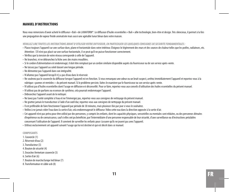 MANUEL D’INSTRUCTIONS Nous vous remercions d’avoir acheté le diffuseur « Bali » de LANAFORM®. Le diffuseur d’huiles essentielles « Bali » allie technologie, bien-être et design. Très silencieux, il permet à la fois une propagation de vapeur froide aromatisée mais aussi une agréable lueur bleue dans votre maison. VEUILLEZ LIRE TOUTES LES INSTRUCTIONS AVANT D’UTILISER VOTRE DIFFUSEUR, EN PARTICULIER CES QUELQUES CONSIGNES DE SECURITE FONDAMENTALES : • Placez toujours l’appareil sur une surface dure, plane et horizontale dans votre intérieur. Eloignez-le légèrement des murs et des sources de chaleur telles que les poêles, radiateurs, etc. Attention : S’il n’est pas placé sur une surface horizontale, il se peut qu’il ne puisse fonctionner correctement. • Vérifiez que la tension de votre réseau corresponde à celle de l’appareil. • Ne branchez, ni ne débranchez la fiche avec des mains mouillées. • Si le cordon d’alimentation est endommagé, il doit être remplacé par un cordon similaire disponible auprès du fournisseur ou de son service après-vente. • Ne laissez pas l’appareil au soleil durant une longue période. • Ne démontez pas l’appareil dans son intégralité. • N’allumez pas l’appareil lorsqu’il n’y a pas d’eau dans le réservoir. • Ne soulevez pas le couvercle du diffuseur lorsque l’appareil est en fonction. Si vous remarquez une odeur ou un bruit suspect, arrêtez immédiatement l’appareil et reportez-vous à la rubrique « pannes et remèdes » du présent manuel. Si le problème persiste, faites-le examiner par le fournisseur ou son service après-vente. • N’utilisez pas d’huiles essentielles dont l’usage en diffusion est déconseillé. Pour ce faire, reportez-vous aux conseils d’utilisation des huiles essentielles du présent manuel. • N’utilisez pas de parfums ou essences de synthèse, cela pourrait endommager l’appareil. • Débranchez l’appareil avant de le nettoyer. • Ne lavez pas l’unité complète à l’eau et ne l’immergez pas, reportez-vous aux consignes de nettoyage du présent manuel. • Ne grattez jamais le transducteur à l’aide d’un outil dur, reportez-vous aux consignes de nettoyage du présent manuel. • Il est préférable de faire fonctionner l’appareil par période de 30 minutes, mais plusieurs fois par jour si vous le souhaitez. • Veillez à ne jamais vider l’eau dans la sortie d’air, cela endommagerait le diffuseur. Videz cette eau dans la direction opposée à la sortie d’air. • Cet appareil n’est pas prévu pour être utilisé par des personnes, y compris les enfants, dont les capacités physiques, sensorielles ou mentales sont réduites, ou des personnes dénuées d’expérience ou de connaissance, sauf si elles ont pu bénéficier, par l’intermédiaire d’une personne responsable de leur sécurité, d’une surveillance ou d’instructions préalables concernant l’utilisation de l’appareil. Il convient de surveiller les enfants pour s’assurer qu’ils ne jouent pas avec l’appareil. • Utilisez exclusivement cet appareil suivant l’usage qui lui est destiné et qui est décrit dans ce manuel. COMPOSANTS 1. Couvercle (1) 2. Réservoir d’eau (2) 3. Transducteur (3) 4. Bouton de sécurité (4) 5. Encoches fermeture couvercle (5) 6. Sortie d’air (6) 7. Bouton de marche/lampe led bleue (7) 8. Transformateur et câble usb (8)