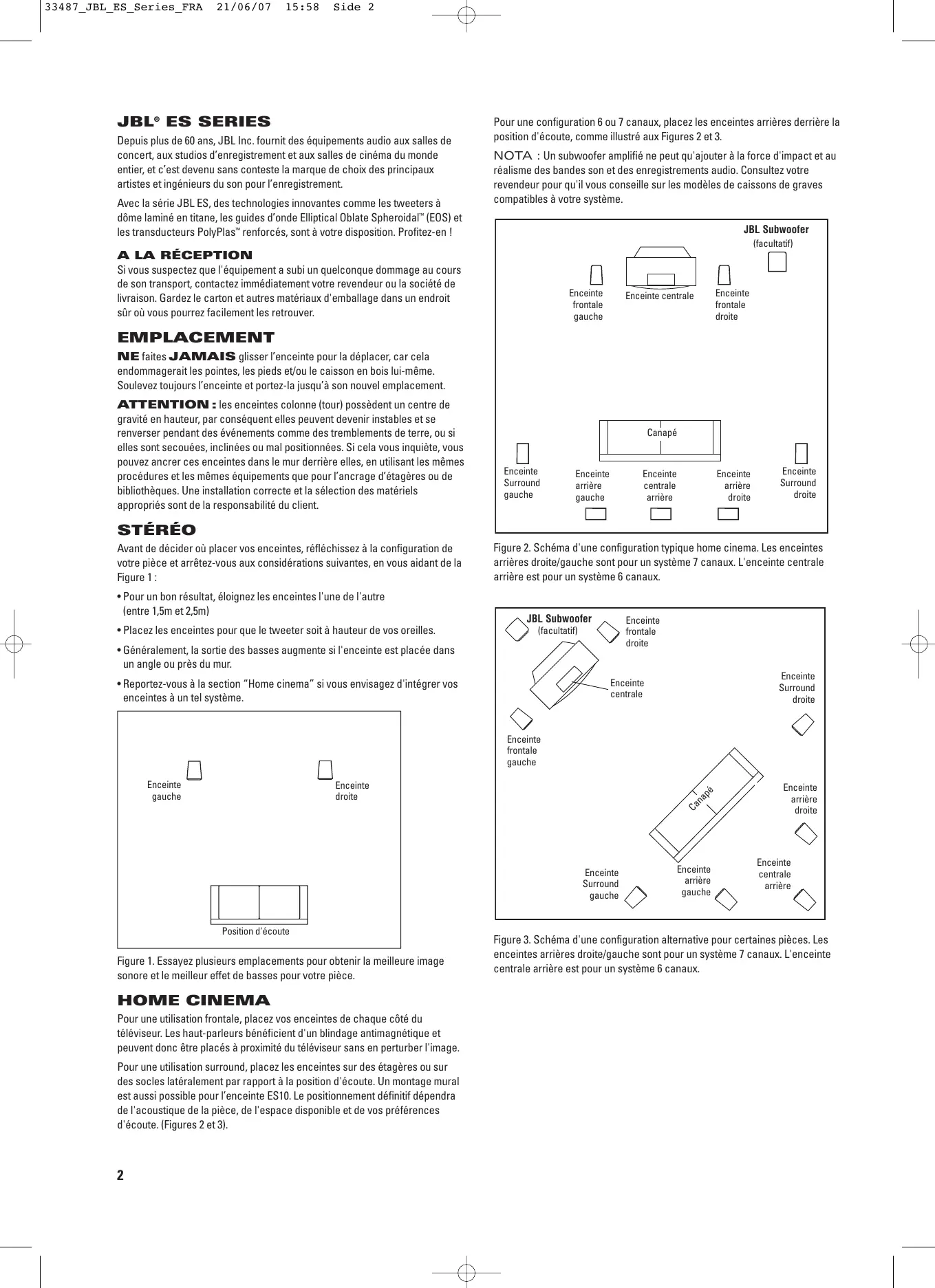 Depuis plus de 60 ans, JBL Inc. fournit des équipements audio aux salles de concert, aux studios d’enregistrement et aux salles de cinéma du monde entier, et c’est devenu sans conteste la marque de choix des principaux artistes et ingénieurs du son pour l’enregistrement. Avec la série JBL ES, des technologies innovantes comme les tweeters à dôme laminé en titane, les guides d’onde Elliptical Oblate Spheroidal™ (EOS) et les transducteurs PolyPlas™ renforcés, sont à votre disposition. Profitez-en ! Pour une configuration 6 ou 7 canaux, placez les enceintes arrières derrière la position d'écoute, comme illustré aux Figures 2 et 3. NOTA : Un subwoofer amplifié ne peut qu'ajouter à la force d'impact et au réalisme des bandes son et des enregistrements audio. Consultez votre revendeur pour qu'il vous conseille sur les modèles de caissons de graves compatibles à votre système. JBL Subwoofer (optional) (facultatif)