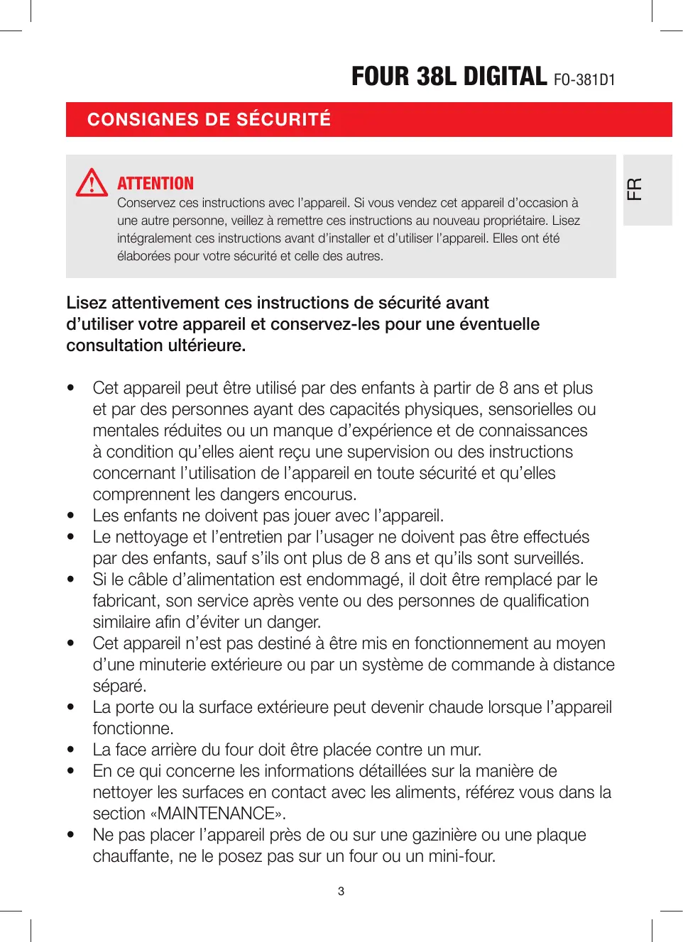 Cet appareil peut être utilisé par des enfants à partir de 8 ans et plus et par des personnes ayant des capacités physiques, sensorielles ou mentales réduites ou un manque d’expérience et de connaissances à condition qu’elles aient reçu une supervision ou des instructions concernant l’utilisation de l’appareil en toute sécurité et qu’elles comprennent les dangers encourus. Les enfants ne doivent pas jouer avec l’appareil. Le nettoyage et l’entretien par l’usager ne doivent pas être effectués par des enfants, sauf s’ils ont plus de 8 ans et qu’ils sont surveillés. Si le câble d’alimentation est endommagé, il doit être remplacé par le fabricant, son service après vente ou des personnes de qualification similaire afin d’éviter un danger. Cet appareil n’est pas destiné à être mis en fonctionnement au moyen d’une minuterie extérieure ou par un système de commande à distance séparé. La porte ou la surface extérieure peut devenir chaude lorsque l’appareil fonctionne. La face arrière du four doit être placée contre un mur. En ce qui concerne les informations détaillées sur la manière de nettoyer les surfaces en contact avec les aliments, référez vous dans la section «MAINTENANCE». Ne pas placer l’appareil près de ou sur une gazinière ou une plaque chauffante, ne le posez pas sur un four ou un mini-four.