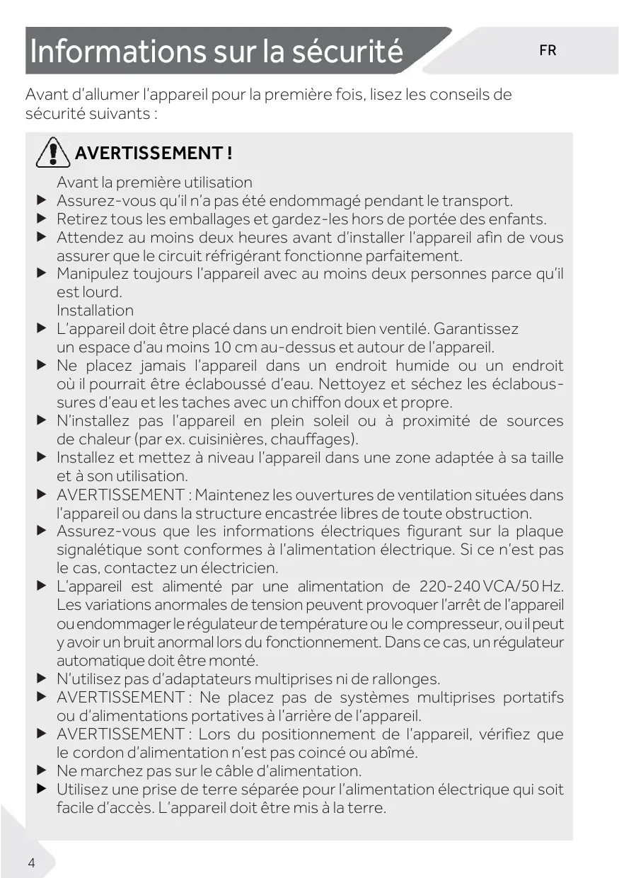 Informations sur la s écurité Avant d’allumer l’appareil pour la première fois, lisez les conseils de sécurité suivants : AVERTISSEMENT ! Avant la première utilisation Assurez-vous qu’il n’a pas été endommagé pendant le transport. Retirez tous les emballages et gardez-les hors de portée des enfants. Attendez au moins deux heures avant d’installer l’appareil afin de vous assurer que le circuit réfrigérant fonctionne parfaitement. Manipulez toujours l’appareil avec au moins deux personnes parce qu’il est lourd. Installation L’appareil doit être placé dans un endroit bien ventilé. Garantissez un espace d’au moins 10 cm au-dessus et autour de l’appareil. Ne placez jamais l’appareil dans un endroit humide ou un endroit où il pourrait être éclaboussé d’eau. Nettoyez et séchez les éclaboussures d’eau et les taches avec un chiffon doux et propre. N’installez pas l’appareil en plein soleil ou à proximité de sources de chaleur (par ex. cuisinières, chauffages). Installez et mettez à niveau l’appareil dans une zone adaptée à sa taille et à son utilisation.