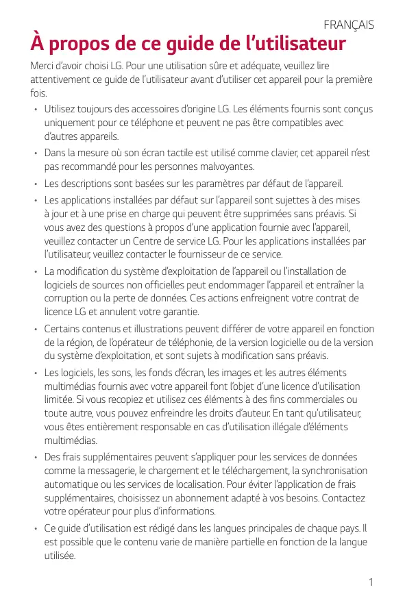 Merci d’avoir choisi LG. Pour une utilisation sûre et adéquate, veuillez lire attentivement ce guide de l’utilisateur avant d’utiliser cet appareil pour la première fois. • Utilisez toujours des accessoires d’origine LG. Les éléments fournis sont conçus uniquement pour ce téléphone et peuvent ne pas être compatibles avec d’autres appareils. • Dans la mesure où son écran tactile est utilisé comme clavier, cet appareil n’est pas recommandé pour les personnes malvoyantes. • Les descriptions sont basées sur les paramètres par défaut de l’appareil. • Les applications installées par défaut sur l’appareil sont sujettes à des mises à jour et à une prise en charge qui peuvent être supprimées sans préavis. Si vous avez des questions à propos d’une application fournie avec l’appareil, veuillez contacter un Centre de service LG. Pour les applications installées par l’utilisateur, veuillez contacter le fournisseur de ce service. • La modification du système d’exploitation de l’appareil ou l’installation de logiciels de sources non officielles peut endommager l’appareil et entraîner la corruption ou la perte de données. Ces actions enfreignent votre contrat de licence LG et annulent votre garantie. • Certains contenus et illustrations peuvent différer de votre appareil en fonction de la région, de l’opérateur de téléphonie, de la version logicielle ou de la version du système d’exploitation, et sont sujets à modification sans préavis. • Les logiciels, les sons, les fonds d’écran, les images et les autres éléments multimédias fournis avec votre appareil font l’objet d’une licence d’utilisation limitée. Si vous recopiez et utilisez ces éléments à des fins commerciales ou toute autre, vous pouvez enfreindre les droits d’auteur. En tant qu’utilisateur, vous êtes entièrement responsable en cas d’utilisation illégale d’éléments multimédias. • Des frais supplémentaires peuvent s’appliquer pour les services de données comme la messagerie, le chargement et le téléchargement, la synchronisation automatique ou les services de localisation. Pour éviter l’application de frais supplémentaires, choisissez un abonnement adapté à vos besoins. Contactez votre opérateur pour plus d’informations. • Ce guide d’utilisation est rédigé dans les langues principales de chaque pays. Il est possible que le contenu varie de manière partielle en fonction de la langue utilisée. 1