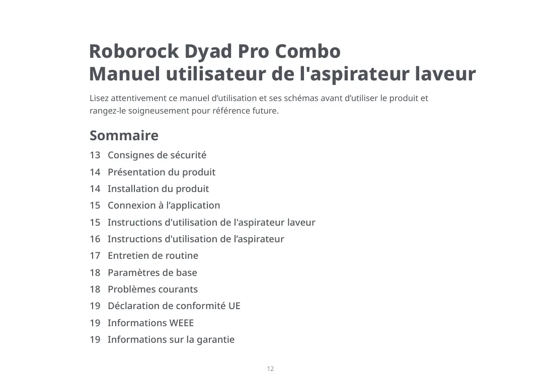 Roborock Dyad Pro Combo Manuel utilisateur de l'aspirateur laveur Lisez attentivement ce manuel d’utilisation et ses schémas avant d’utiliser le produit et rangez-le soigneusement pour référence future. Sommaire 13 Consignes de sécurité 14 Présentation du produit 14 Installation du produit 15 Connexion à l’application 15 Instructions d'utilisation de l'aspirateur laveur 16 Instructions d'utilisation de l’aspirateur 17 Entretien de routine 18 Paramètres de base 18 Problèmes courants 19 Déclaration de conformité UE 19 Informations WEEE 19 Informations sur la garantie