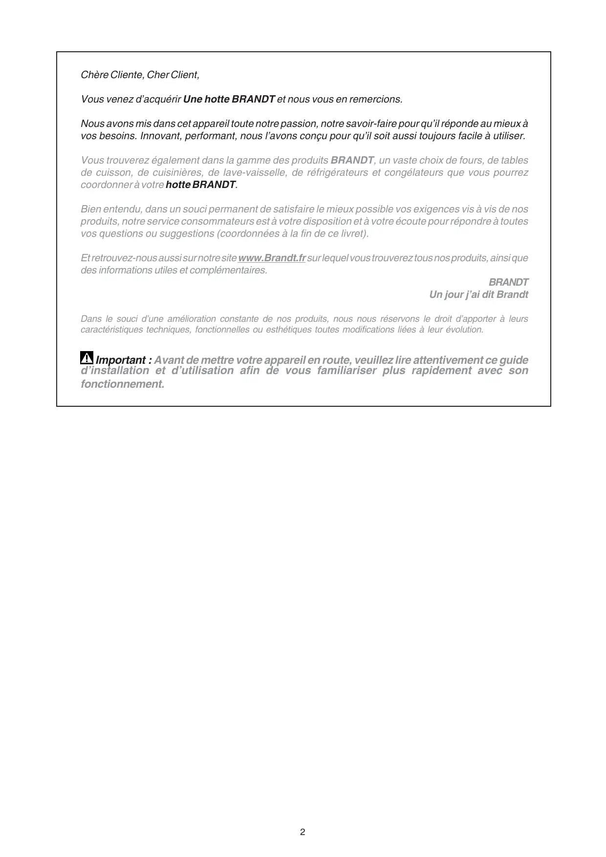 Chère Cliente, Cher Client, Vous venez d’acquérir Une hotte BRANDT et nous vous en remercions. Nous avons mis dans cet appareil toute notre passion, notre savoir-faire pour qu’il réponde au mieux à vos besoins. Innovant, performant, nous l’avons conçu pour qu’il soit aussi toujours facile à utiliser. Vous trouverez également dans la gamme des produits BRANDT, un vaste choix de fours, de tables de cuisson, de cuisinières, de lave-vaisselle, de réfrigérateurs et congélateurs que vous pourrez coordonner à votre hotte BRANDT. Bien entendu, dans un souci permanent de satisfaire le mieux possible vos exigences vis à vis de nos produits, notre service consommateurs est à votre disposition et à votre écoute pour répondre à toutes vos questions ou suggestions (coordonnées à la fin de ce livret). Et retrouvez-nous aussi sur notre site www.Brandt.fr sur lequel vous trouverez tous nos produits, ainsi que des informations utiles et complémentaires. BRANDT Un jour j’ai dit Brandt Dans le souci d’une amélioration constante de nos produits, nous nous réservons le droit d’apporter à leurs caractéristiques techniques, fonctionnelles ou esthétiques toutes modifications liées à leur évolution. Important : Avant de mettre votre appareil en route, veuillez lire attentivement ce guide d’installation et d’utilisation afin de vous familiariser plus rapidement avec son fonctionnement.