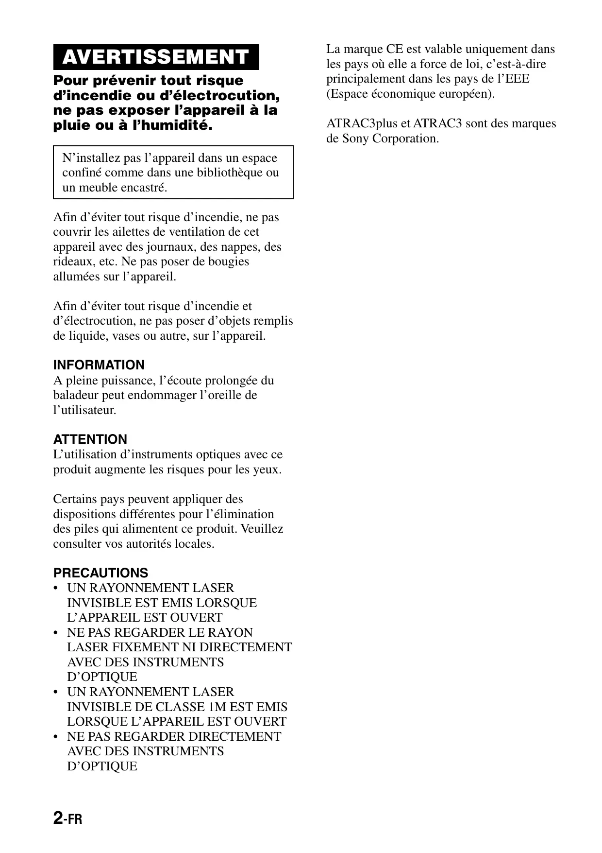 AVERTISSEMENT Pour prévenir tout risque d’incendie ou d’électrocution, ne pas exposer l’appareil à la pluie ou à l’humidité. N’installez pas l’appareil dans un espace confiné comme dans une bibliothèque ou un meuble encastré. Afin d’éviter tout risque d’incendie, ne pas couvrir les ailettes de ventilation de cet appareil avec des journaux, des nappes, des rideaux, etc. Ne pas poser de bougies allumées sur l’appareil. Afin d’éviter tout risque d’incendie et d’électrocution, ne pas poser d’objets remplis de liquide, vases ou autre, sur l’appareil. INFORMATION A pleine puissance, l’écoute prolongée du baladeur peut endommager l’oreille de l’utilisateur. ATTENTION L’utilisation d’instruments optiques avec ce produit augmente les risques pour les yeux. Certains pays peuvent appliquer des dispositions différentes pour l’élimination des piles qui alimentent ce produit. Veuillez consulter vos autorités locales. PRECAUTIONS • UN RAYONNEMENT LASER INVISIBLE EST EMIS LORSQUE L’APPAREIL EST OUVERT • NE PAS REGARDER LE RAYON LASER FIXEMENT NI DIRECTEMENT AVEC DES INSTRUMENTS D’OPTIQUE • UN RAYONNEMENT LASER INVISIBLE DE CLASSE 1M EST EMIS LORSQUE L’APPAREIL EST OUVERT • NE PAS REGARDER DIRECTEMENT AVEC DES INSTRUMENTS D’OPTIQUE