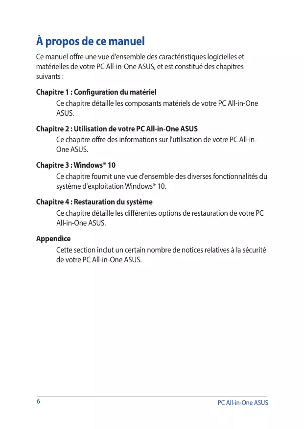 À propos de ce manuel Ce manuel offre une vue d'ensemble des caractéristiques logicielles et matérielles de votre PC All-in-One ASUS, et est constitué des chapitres suivants :