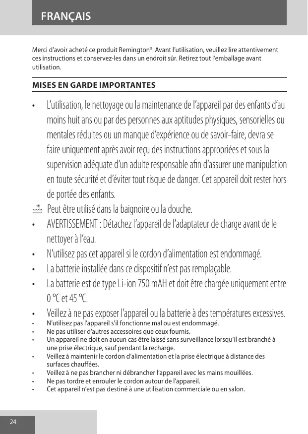 FRANÇAIS Merci d’avoir acheté ce produit Remington®. Avant l’utilisation, veuillez lire attentivement ces instructions et conservez-les dans un endroit sûr. Retirez tout l’emballage avant utilisation.