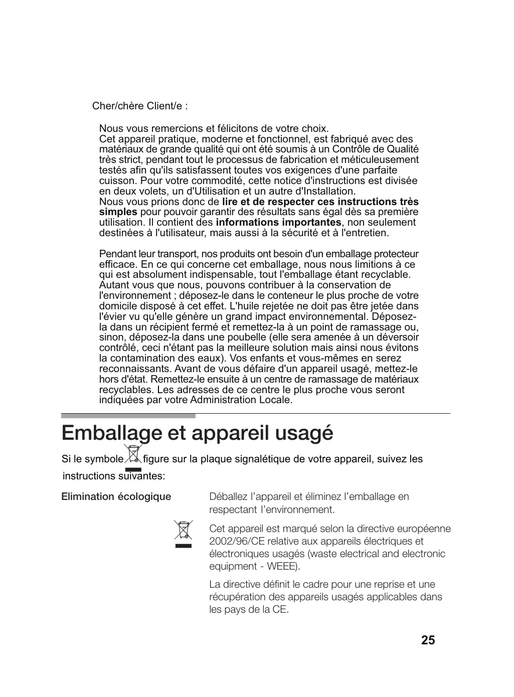 Nous vous prions donc de dire et de respecter ces instructions très simples pour pouvoir garantir des résultats sans égalès sa première utilisation. Il contient des informations importantes, non seulement destinées à l'utilisateur, mais aussi à la sécurité et à l'entretien.