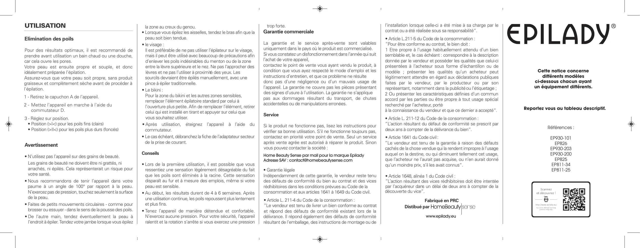 • Tenez l’appareil de manière détendue et confortable. N’exercez aucune pression. Pour votre sécurité, l’appareil ralentit et la rotation s’arrête si vous exercez une pression trop forte. Garantie commerciale La garantie et le service après-vente sont valables uniquement dans le pays où le produit est commercialisé. Si vous constatez un disfonctionnement dans l’année qui suit l’achat de votre appareil, contactez le point de vente vous ayant vendu le produit, à condition que vous ayez respecté le mode d’emploi et les instructions d’entretien, et que ce problème ne résulte donc pas d’une négligence ou d’un mauvais usage de l’appareil. La garantie ne couvre pas les pièces présentant des signes d’usure à l’utilisation. La garantie ne s’applique pas aux dommages résultant du transport, de chutes accidentelles ou de manipulations erronées. Service Si le produit ne fonctionne pas, lisez les instructions pour vérifier sa bonne utilisation. S’il ne fonctionne toujours pas, contactez en priorité votre point de vente. Seul un service après vente agrée est autorisé à réparer le produit. Sinon vous pouvez contacter la société : Europe parpar mail. Epilady Home Beauty Sense mail pour la marque Epilady Email: sav@epilady-europe.com Adresse SAV : contact@homebeautysense.com