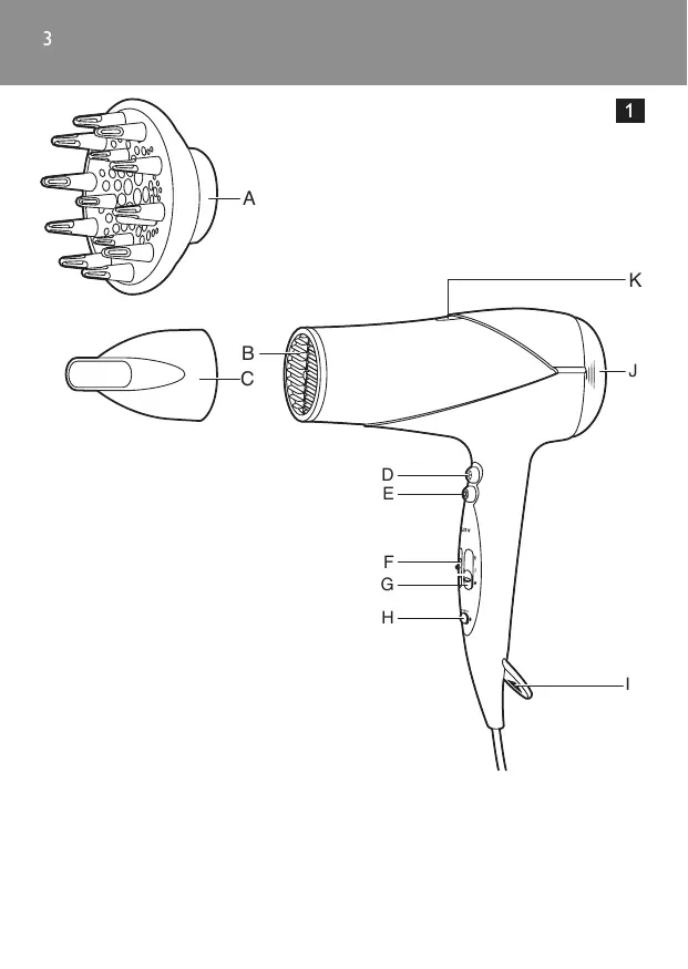 Interrupteur du flux d’air II = flux d’air puissant pour un séchage rapide I = flux d’air doux spécialement conçu pour la mise en forme 0 = arrêt Bouton de réglage de la température 6 Chaud 5 Modéré 4 Froid Interrupteur du système ionisant (HP8183/HP8182 uniquement) Anneau de suspension Grille d’entrée d’air amovible Voyant du système ionisant (HP8183/HP8182 uniquement) Important