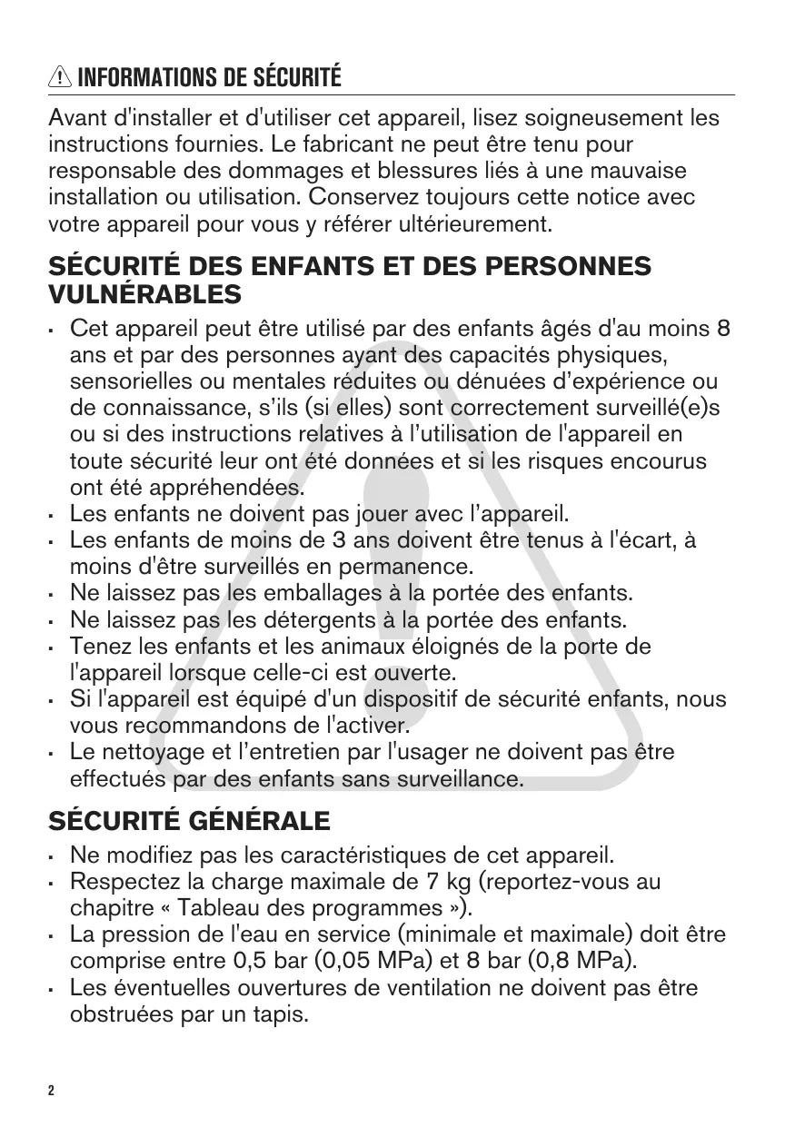 Les enfants de moins de 3 ans doivent être tenus à l'écart, à moins d'être surveillés en permanence. Ne laissez pas les emballages à la portée des enfants. Ne laissez pas les détergents à la portée des enfants. Tenez les enfants et les animaux éloignés de la porte de l'appareil lorsque celle-ci est ouverte. Si l'appareil est équipé d'un dispositif de sécurité enfants, nous vous recommandons de l'activer. Le nettoyage et l’entretien par l'usager ne doivent pas être effectués par des enfants sans surveillance.