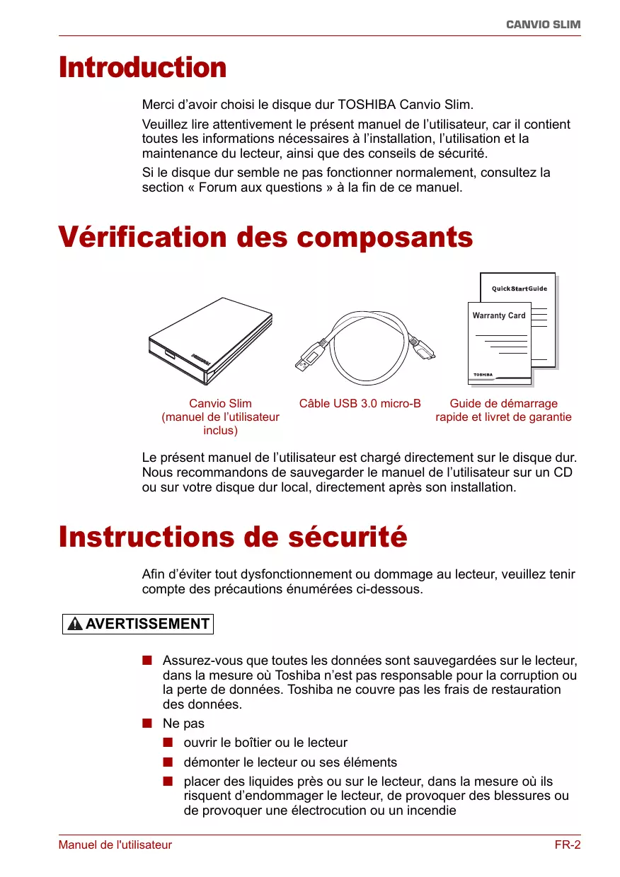 CANVIO SLIM Introduction Merci d’avoir choisi le disque dur TOSHIBA Canvio Slim. Veuillez lire attentivement le présent manuel de l’utilisateur, car il contient toutes les informations nécessaires à l’installation, l’utilisation et la maintenance du lecteur, ainsi que des conseils de sécurité. Si le disque dur semble ne pas fonctionner normalement, consultez la section « Forum aux questions » à la fin de ce manuel.