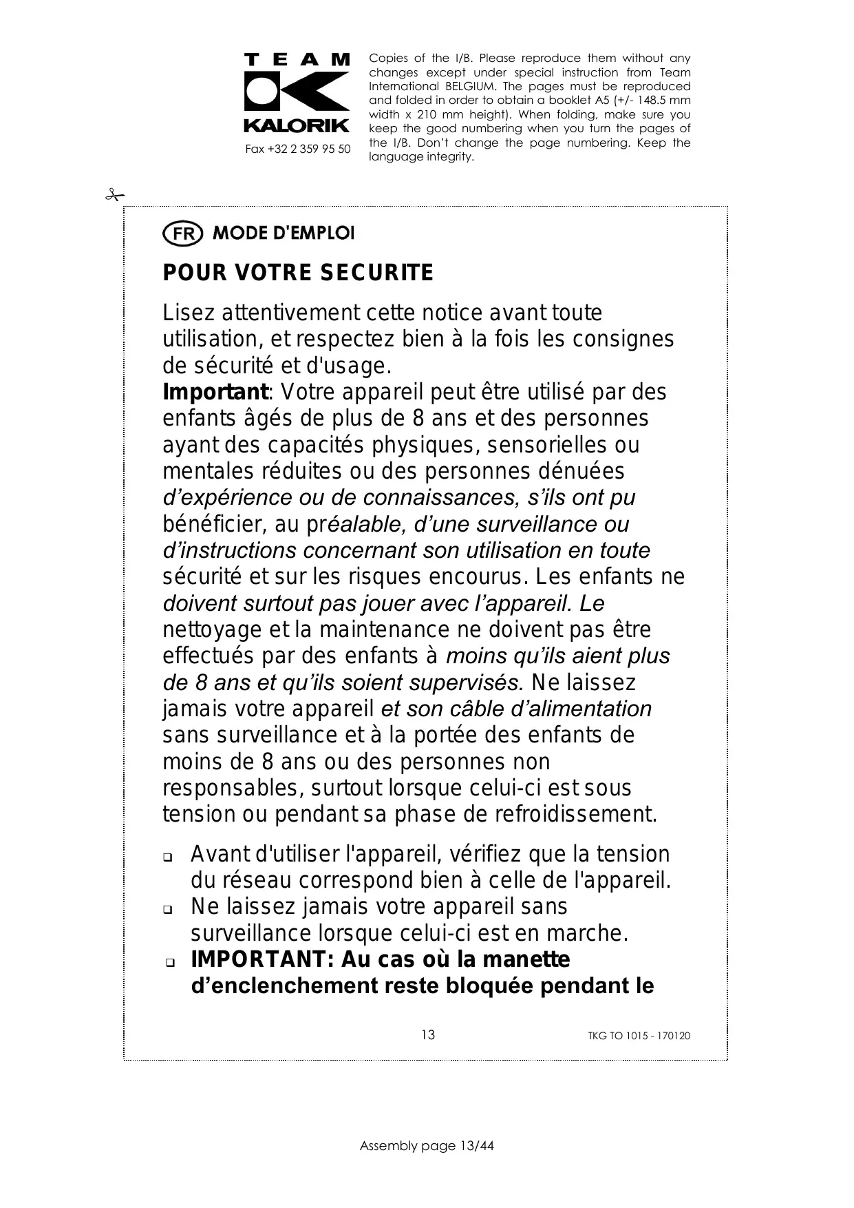 Afin de préserver notre environnement et notre santé, l’élimination en fin de vie des appareils électriques et électroniques doit se faire selon des règles bien précises et nécessite l’implication de chacun, qu’il soit fournisseur ou utilisateur. C’est pour cette raison que votre appareil, tel que le signale le symbole apposé sur sa plaque signalétique ou sur l'emballage, ne doit en aucun cas être jeté dans une poubelle publique ou privée destinée aux ordures ménagères. L'utilisateur a le droit de déposer l'appareil dans des lieux publics de collecte procédant à un tri sélectif des déchets pour être soit recyclé, soit réutilisé pour d’autres applications conformément à la directive. Déclaration ErP – Directive 1275/2008/CE Nous, Team Kalorik Group SA/NV, confirmons par la présente que notre produit correspond aux exigences de la directive 1275/2008/CE. Notre produit n’est pas équipé d’un mode veille, car il s’éteint complètement immédiatement après avoir fini sa fonction principale et par conséquent ne consomme pas d’énergie électrique! La notice d’utilisation est aussi disponible en format électronique sur simple demande auprès du service après-vente (voir carte de garantie).