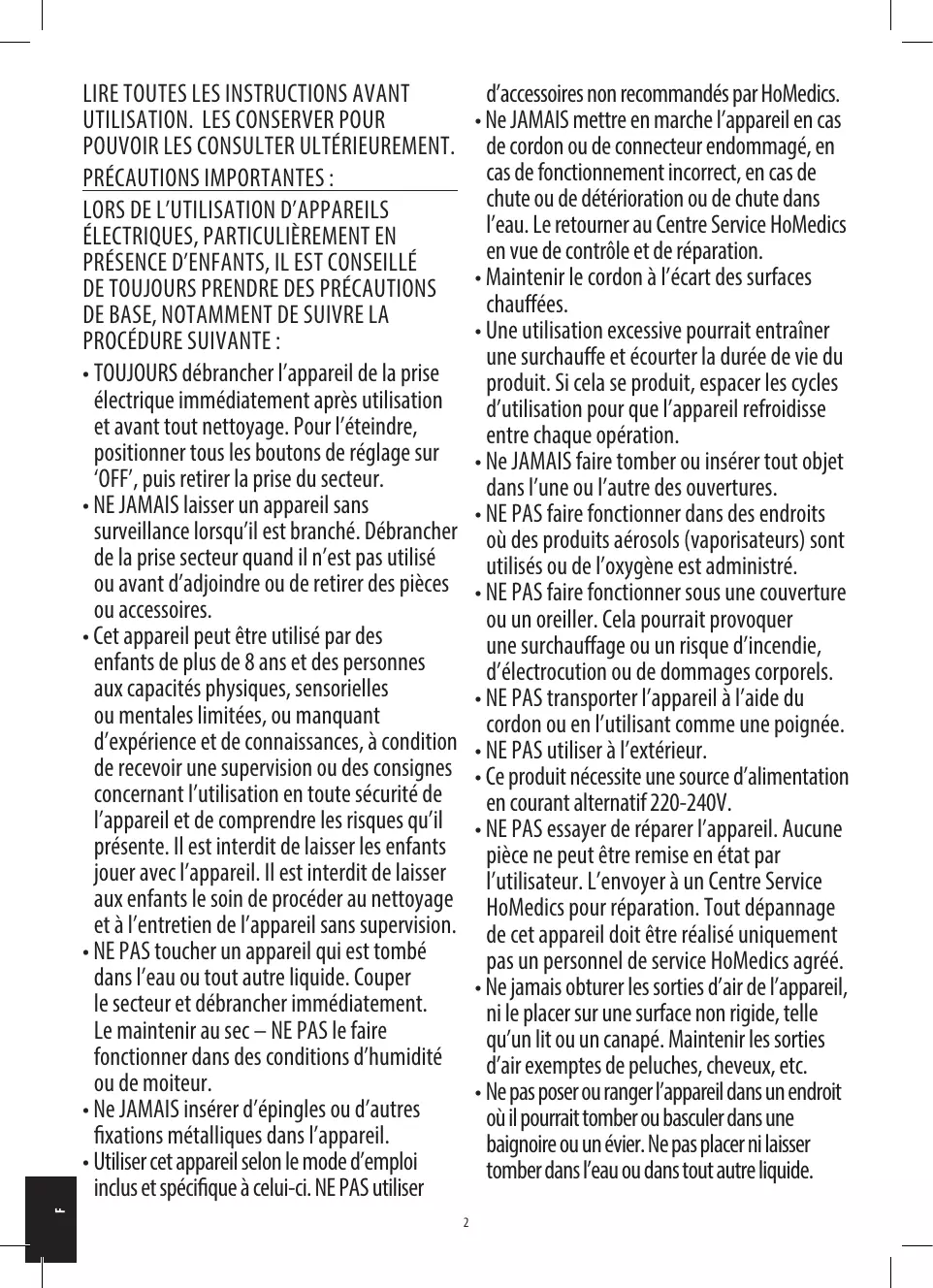 d’accessoires non recommandés par HoMedics. • Ne JAMAIS mettre en marche l’appareil en cas de cordon ou de connecteur endommagé, en cas de fonctionnement incorrect, en cas de chute ou de détérioration ou de chute dans l’eau. Le retourner au Centre Service HoMedics en vue de contrôle et de réparation. • Maintenir le cordon à l’écart des surfaces chauffées. • Une utilisation excessive pourrait entraîner une surchauffe et écourter la durée de vie du produit. Si cela se produit, espacer les cycles d’utilisation pour que l’appareil refroidisse entre chaque opération. • Ne JAMAIS faire tomber ou insérer tout objet dans l’une ou l’autre des ouvertures. • NE PAS faire fonctionner dans des endroits où des produits aérosols (vaporisateurs) sont utilisés ou de l’oxygène est administré. • NE PAS faire fonctionner sous une couverture ou un oreiller. Cela pourrait provoquer une surchauffage ou un risque d’incendie, d’électrocution ou de dommages corporels. • NE PAS transporter l’appareil à l’aide du cordon ou en l’utilisant comme une poignée. • NE PAS utiliser à l’extérieur. • Ce produit nécessite une source d’alimentation en courant alternatif 220-240V. • NE PAS essayer de réparer l’appareil. Aucune pièce ne peut être remise en état par l’utilisateur. L’envoyer à un Centre Service HoMedics pour réparation. Tout dépannage de cet appareil doit être réalisé uniquement pas un personnel de service HoMedics agréé. • Ne jamais obturer les sorties d’air de l’appareil, ni le placer sur une surface non rigide, telle qu’un lit ou un canapé. Maintenir les sorties d’air exemptes de peluches, cheveux, etc. • Ne pas poser ou ranger l’appareil dans un endroit où il pourrait tomber ou basculer dans une baignoire ou un évier. Ne pas placer ni laisser tomber dans l’eau ou dans tout autre liquide. 2