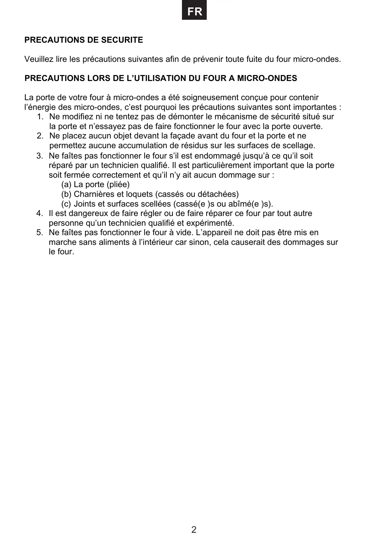 Veuillez lire les précautions suivantes afin de prévenir toute fuite du four micro-ondes. PRECAUTIONS LORS DE L’UTILISATION DU FOUR A MICRO-ONDES La porte de votre four à micro-ondes a été soigneusement conçue pour contenir l’énergie des micro-ondes, c’est pourquoi les précautions suivantes sont importantes :