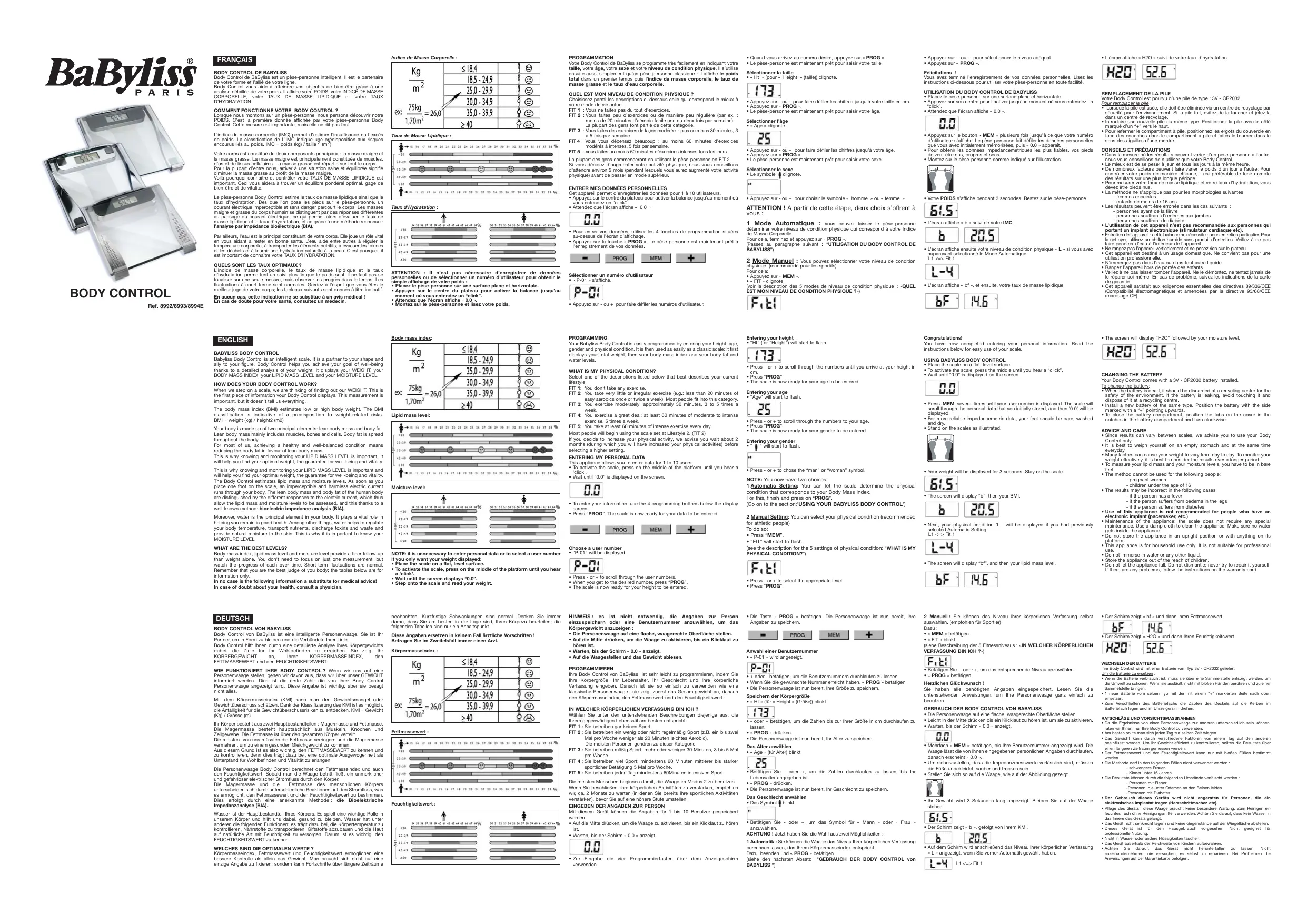 Body Control de BaByliss est un pèse-personne intelligent. Il est le partenaire de votre forme et l’allié de votre ligne. Body Control vous aide à atteindre vos objectifs de bien-être grâce à une analyse détaillée de votre poids. Il affiche votre POIDS, votre INDICE DE MASSE CORPORELLE, votre TAUX DE MASSE LIPIDIQUE et votre TAUX D’HYDRATATION. COMMENT FONCTIONNE VOTRE BODY CONTROL ? Lorsque nous montons sur un pèse-personne, nous pensons découvrir notre POIDS. C’est la première donnée affichée par votre pèse-personne Body Control. Cette mesure est importante, mais elle ne dit pas tout. L’indice de masse corporelle (IMC) permet d’estimer l’insuffisance ou l’excès de poids. La classification de L’IMC indique une prédisposition aux risques encourus liés au poids. IMC = poids (kg) / taille 2 (m2) Taux de Masse Lipidique : Votre corps est constitué de deux composants principaux : la masse maigre et la masse grasse. La masse maigre est principalement constituée de muscles, d’os et de tissus cellulaires. La masse grasse est répartie sur tout le corps. Pour la plupart d’entre nous, arriver à une situation saine et équilibrée signifie diminuer la masse grasse au profit de la masse maigre. Voilà pourquoi connaître et contrôler votre TAUX DE MASSE LIPIDIQUE est important. Ceci vous aidera à trouver un équilibre pondéral optimal, gage de bien-être et de vitalité. Le pèse-personne Body Control estime le taux de masse lipidique ainsi que le taux d’hydratation. Dès que l’on pose les pieds sur le pèse-personne, un courant électrique imperceptible et sans danger parcourt le corps. Les masses maigre et grasse du corps humain se distinguent par des réponses différentes au passage du courant électrique, ce qui permet alors d’évaluer le taux de masse lipidique et le taux d’hydratation, et ce grâce à une méthode reconnue : l’analyse par impédance bioélectrique (BIA). BODY CONTROL En aucun cas, cette indication ne se substitue à un avis médical ! En cas de doute pour votre santé, consultez un médecin. Ref. 8992/8993/8994E ENGLISH Taux d’Hydratation : ATTENTION : Il n’est pas nécessaire d’enregistrer de données personnelles ou de sélectionner un numéro d’utilisateur pour obtenir le simple affichage de votre poids :
